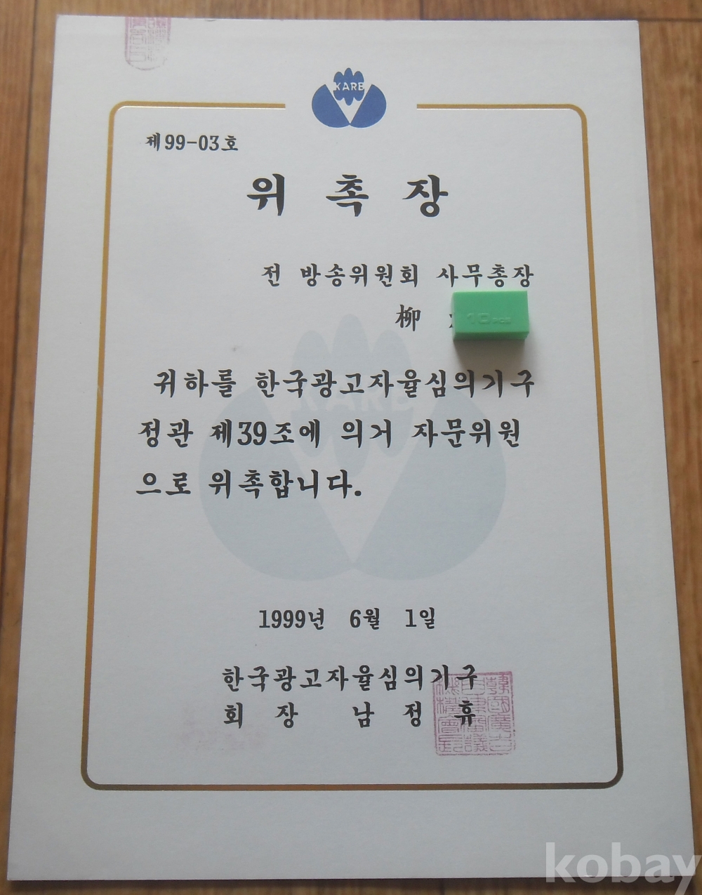 1999년 한국광고자율심의기구 자문위원 위촉장