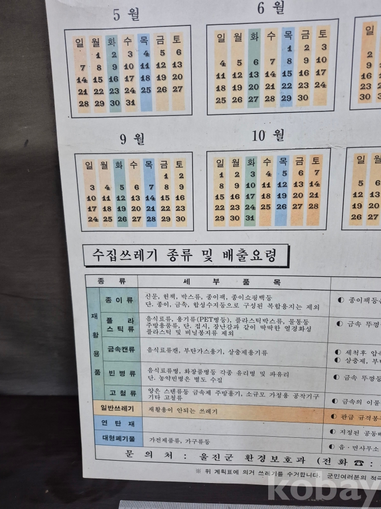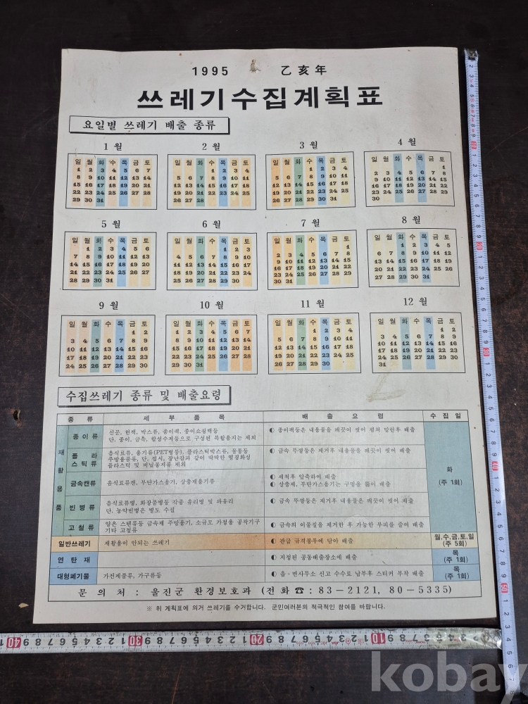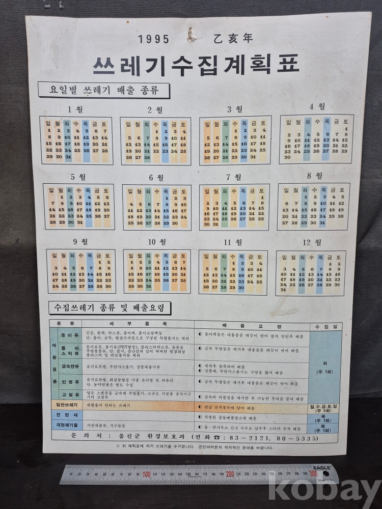 1995년 쓰레기 수집 계획표 요일별 쓰레기 배출종류및 수집쓰레기 종류미치 배출요령 설명 포스터 울진군 환경보호가 53*39