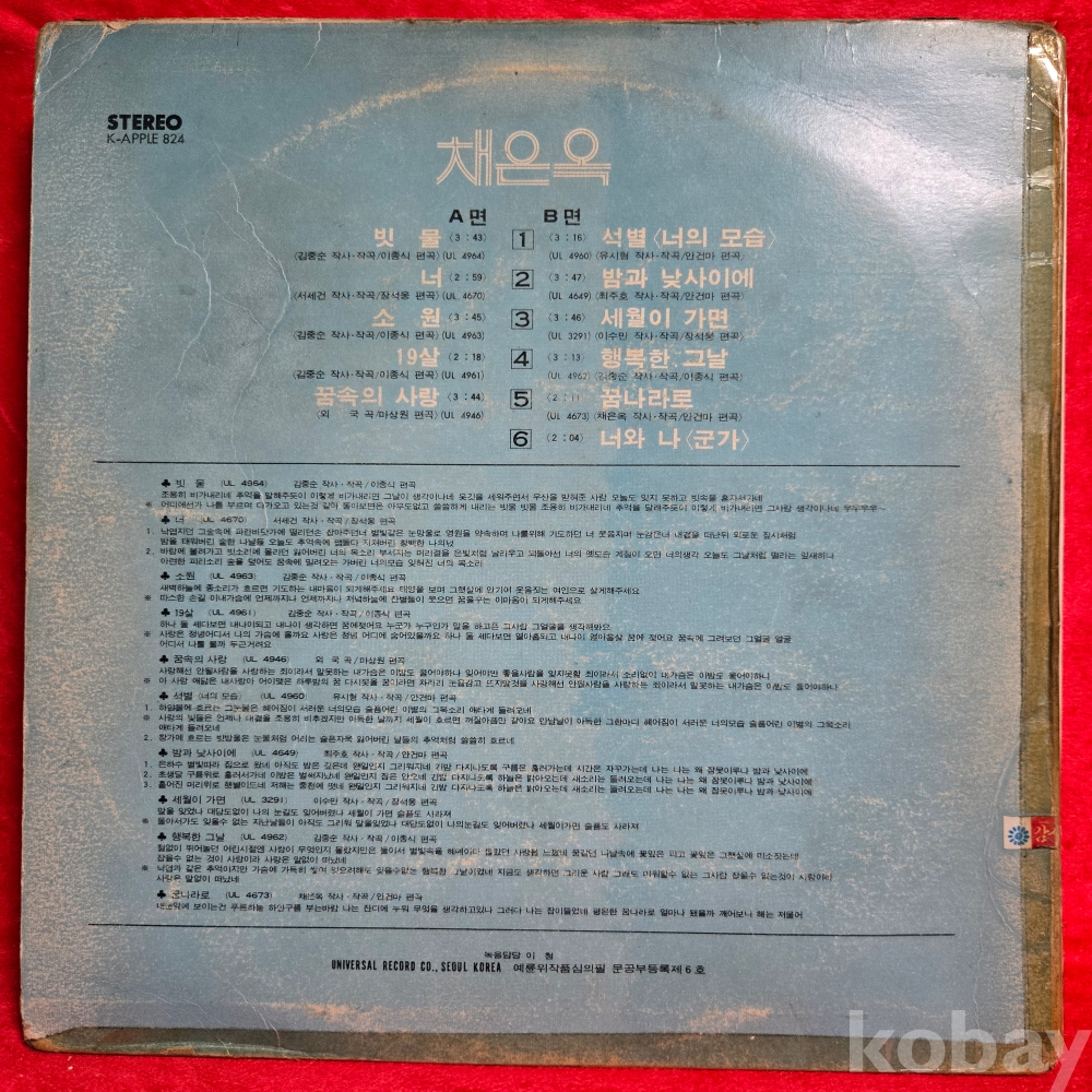 | 자켓상태 | VG : 주름, 접힘, 모서리 찢김 다수 | 음반상태 | EX : 재생에 영향 없는 가벼운 기스 존재 | 발매정보 | 초반 | 가사지여부 | 유 |