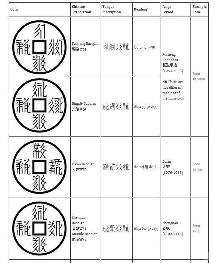 서하(西夏, 1038~1227) 왕국은 독자적인 서하 문자(탕구트 문자)와 한자를 병기하거나 각각 사용한 동전을