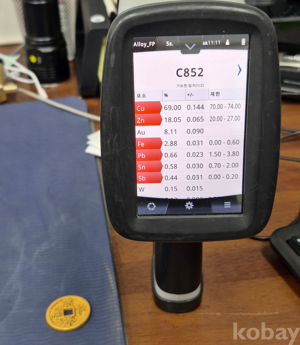 사용해서 검측한 결과 구리가 69% 이고 금이
