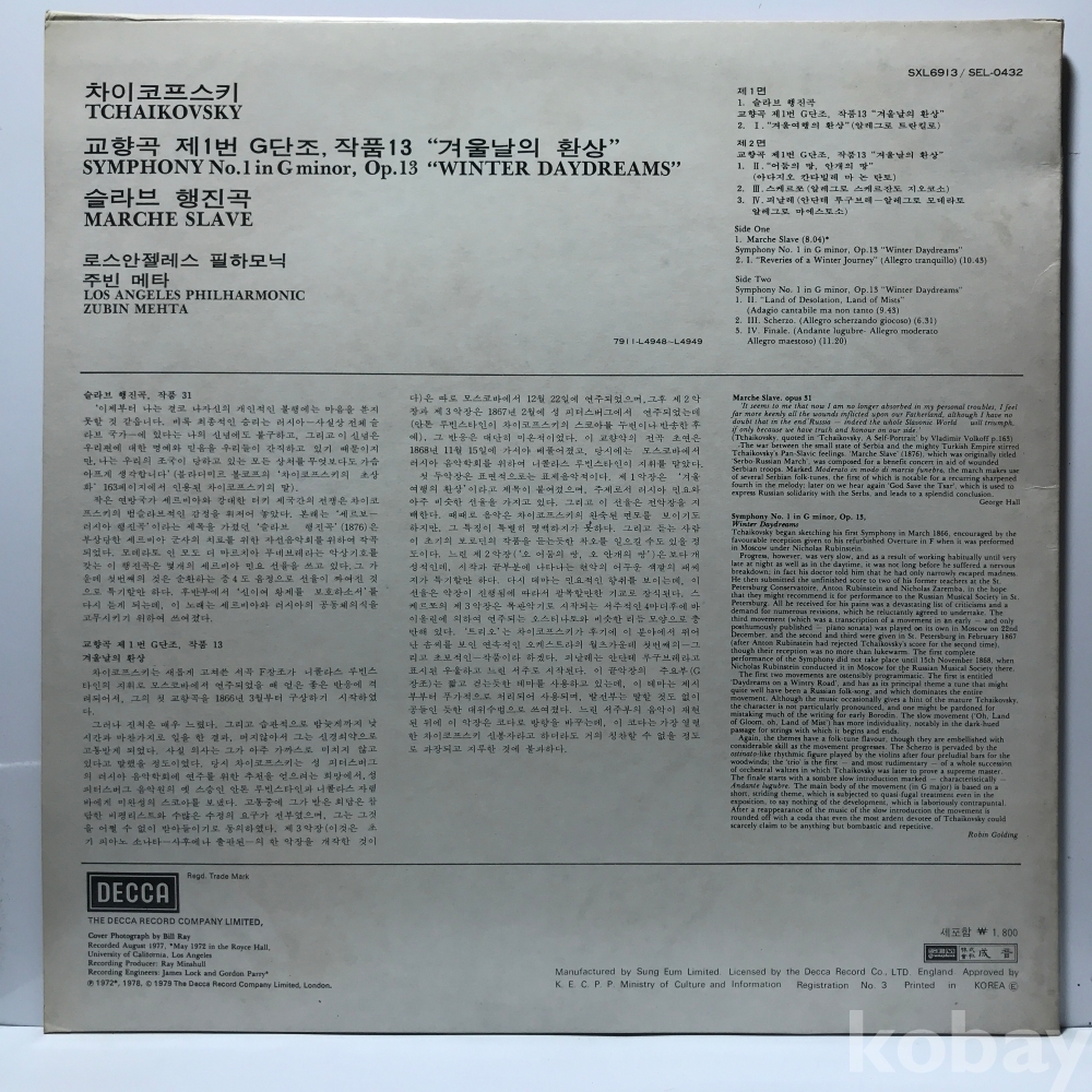 LP 22,670-71 차이코프스키 교향곡 1번 겨울날의 백일몽 - 주빈 메타 / LA 필 80 성음 자켓 EX 알판 EX+
