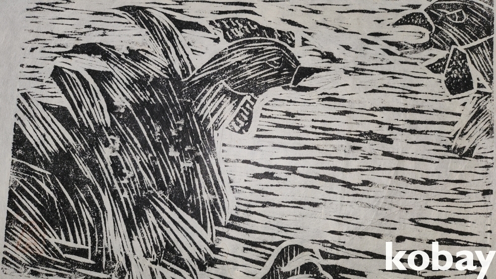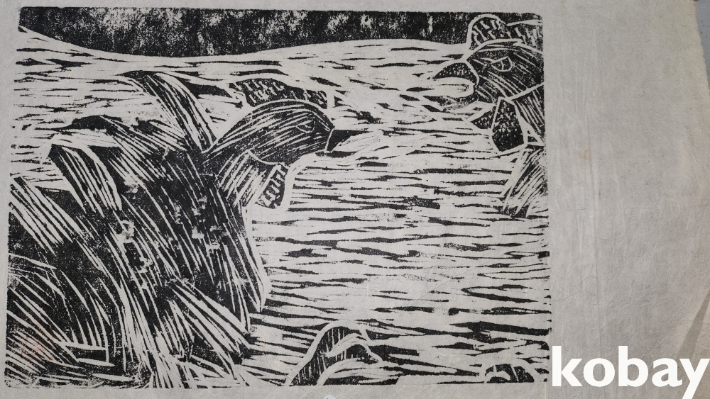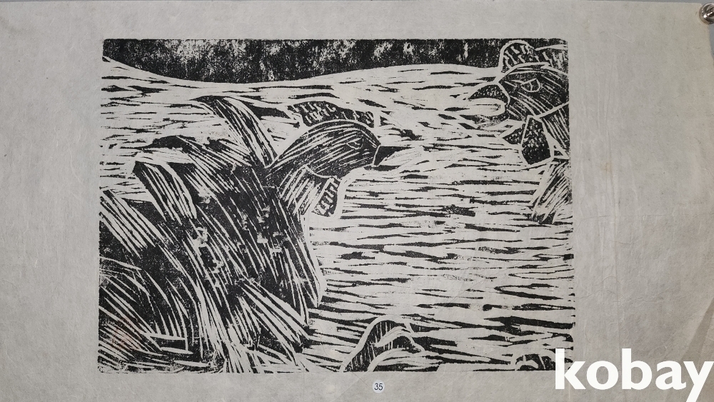 수근 사인이 보이는 "두마리의 새"목판화입니다,