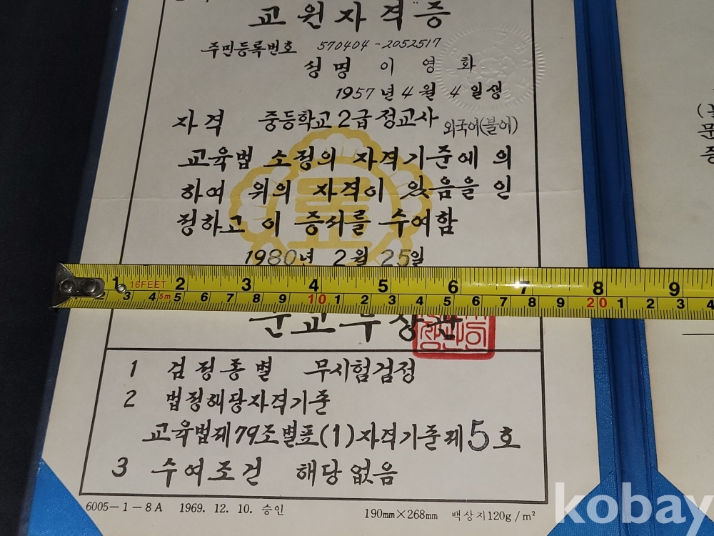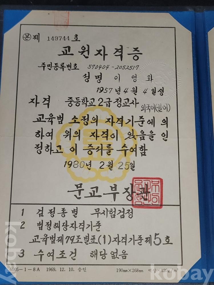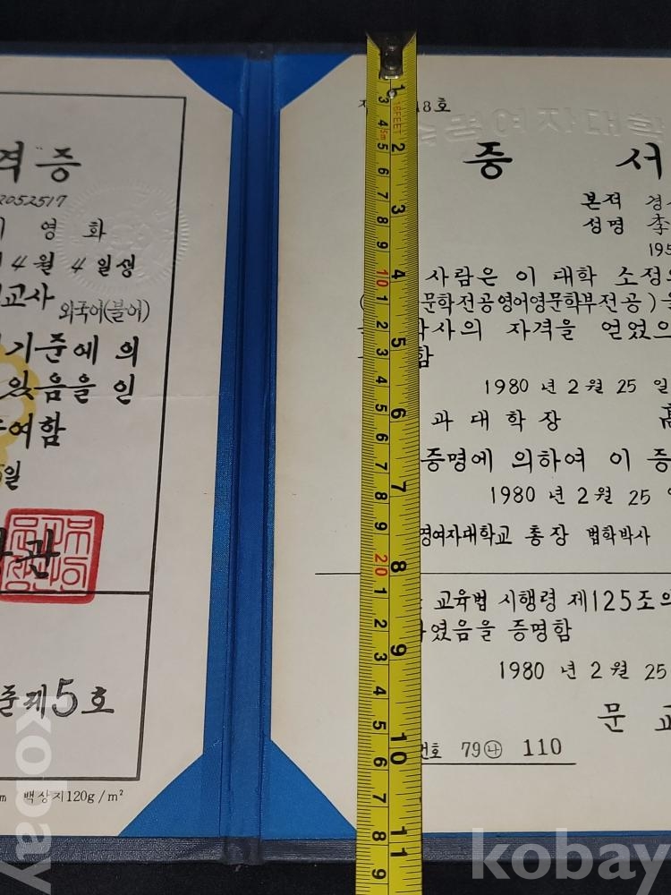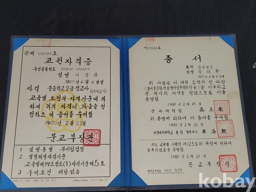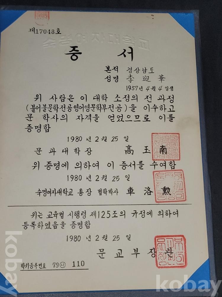 빈티지 1980년 문교부 장관 수여 중등학교 2급 정교사 교원자격증, 숙명여대 불어불문학 전공 영어영문학부 전공 이수 학사 증서 등 2장 일괄입니다.