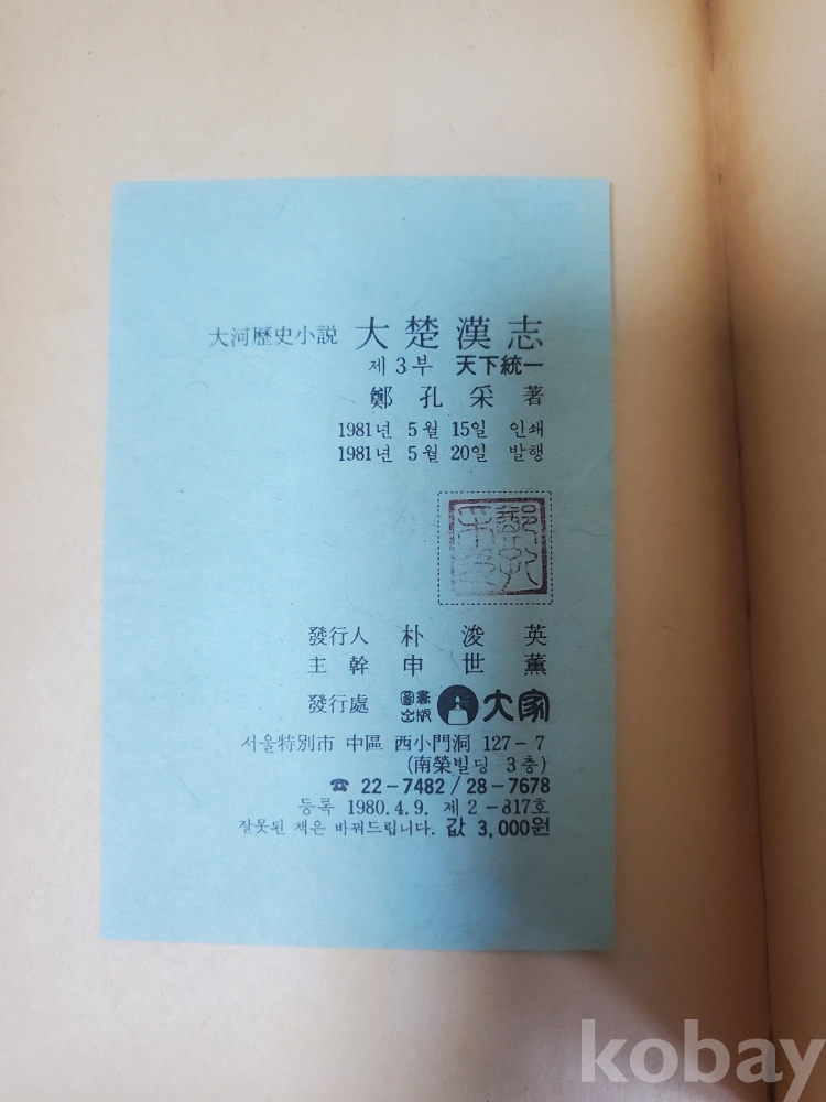 1. 대초한지 전3책정공채, 도서출판 대가, 1980년, 대하역사소설, 상태 상, 사진 참조