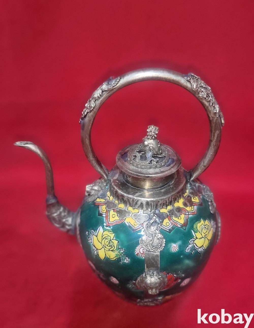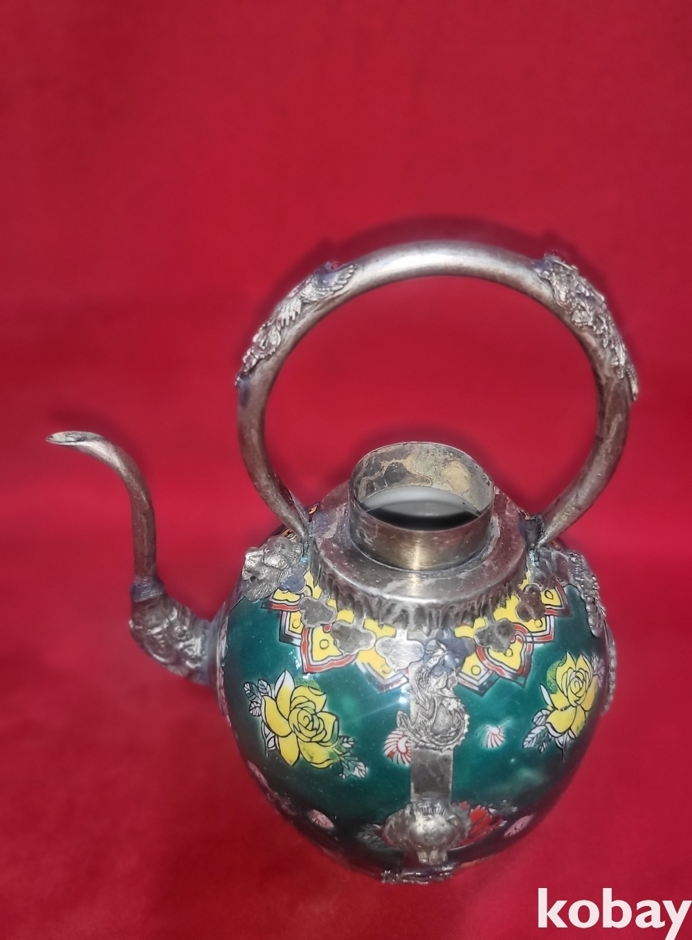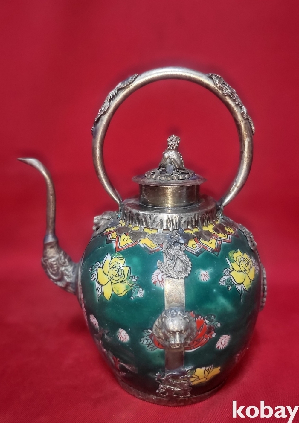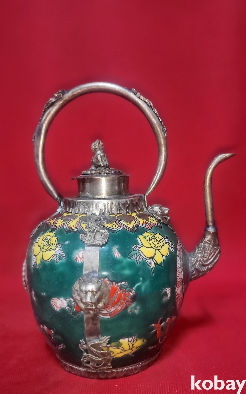 도자기에 백동 합취된 꽃문양 주전자입니다,