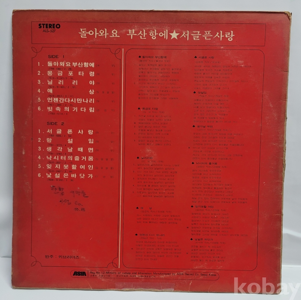 | 자켓상태 | VG : 주름, 접힘, 모서리 찢김 다수 | 음반상태 | VG : 생활 기스 다수, 가벼운 노이즈 존재 | 발매정보 | 초반 | 가사지여부 | 무 |
