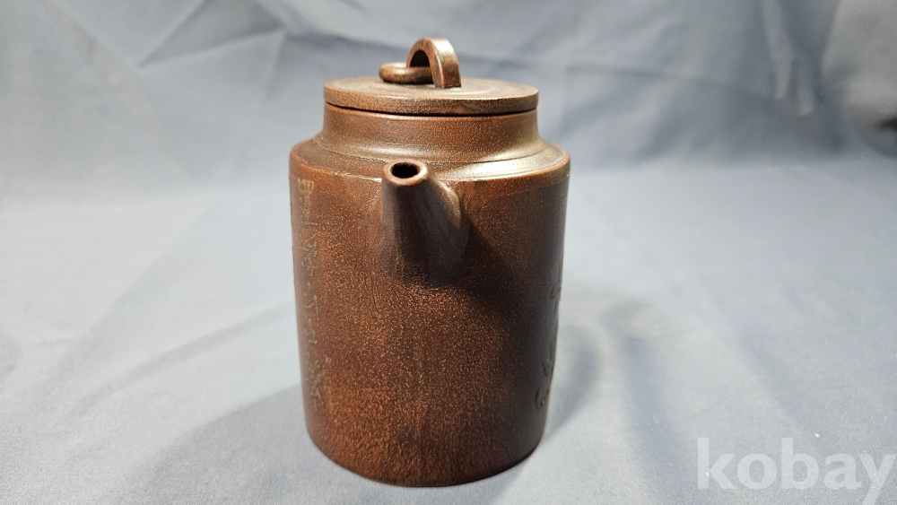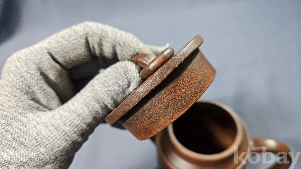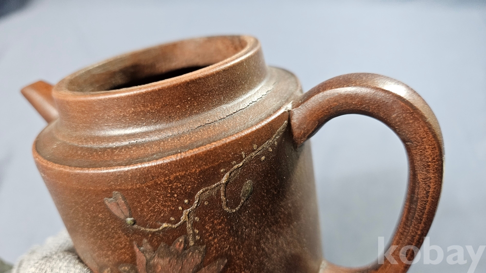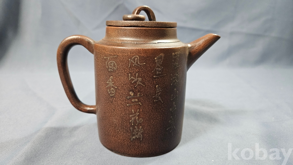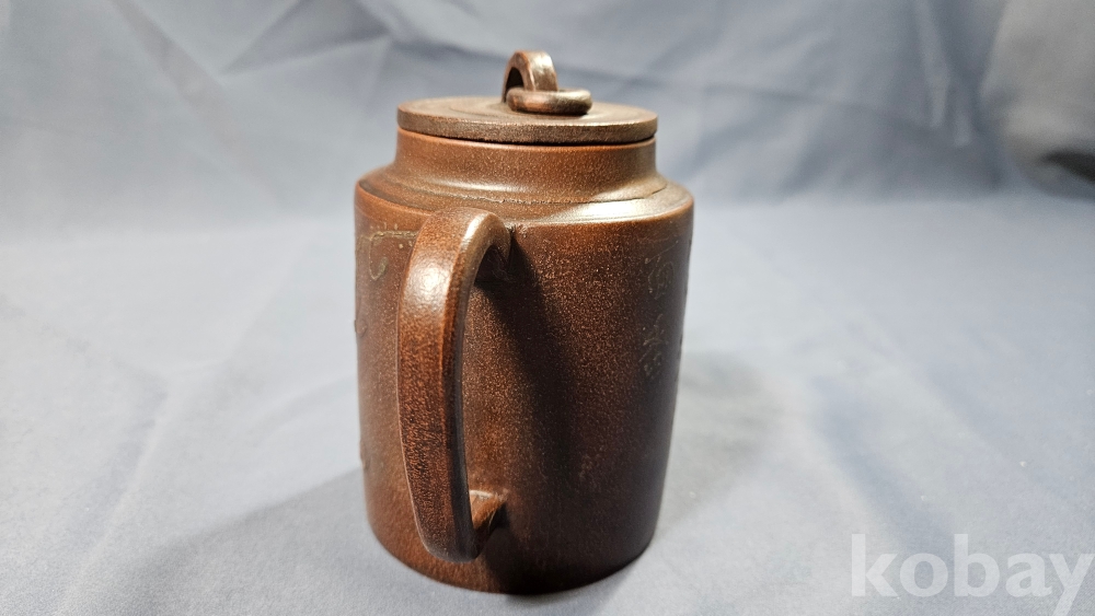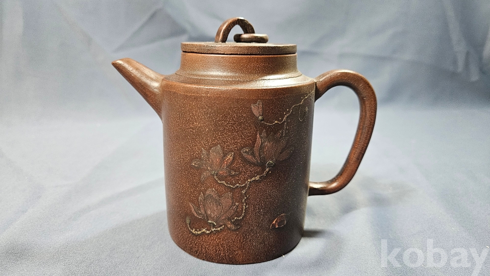 연꽃문양과 글귀가 들어있는 고태미가 넘치는 자사주전자 입니다.