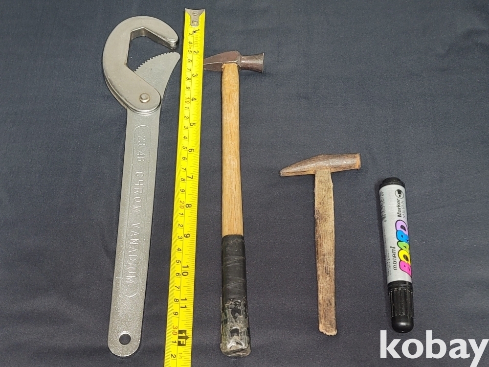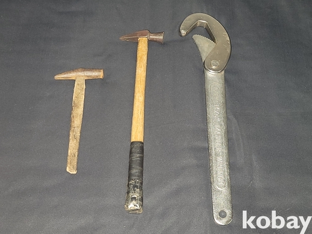 빈티지 세월 감이 느껴지는 옛날 망치 2종과 스패너 등 3종 일괄입니다.