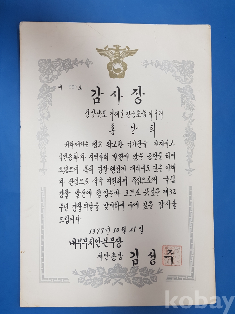 **** [경찰자료] 1977년 내무부치안본부장 감사장(경남 거제군 장승포읍)