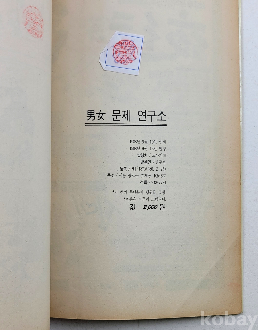 물 품 명 | 조주청 • 손바닥만화 / 남녀문제 연구소 / 1988년 초판 / 코아기획 |