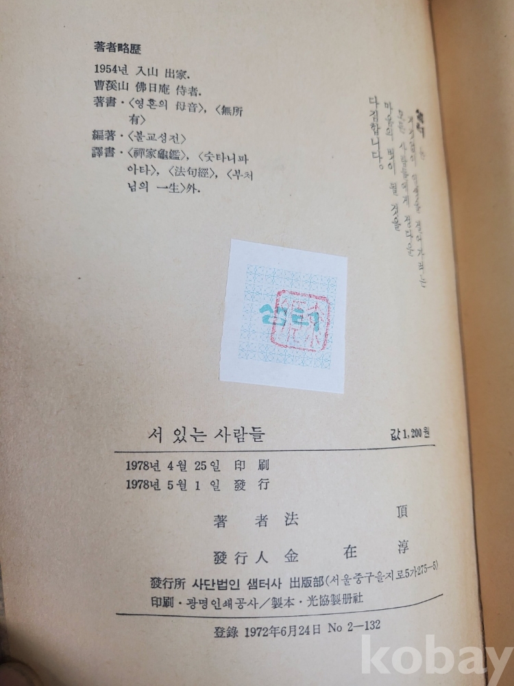 1. 서 있는 사람들, 법정, 샘터사, 1978년, 341쪽, 상태 상, 사진 참조