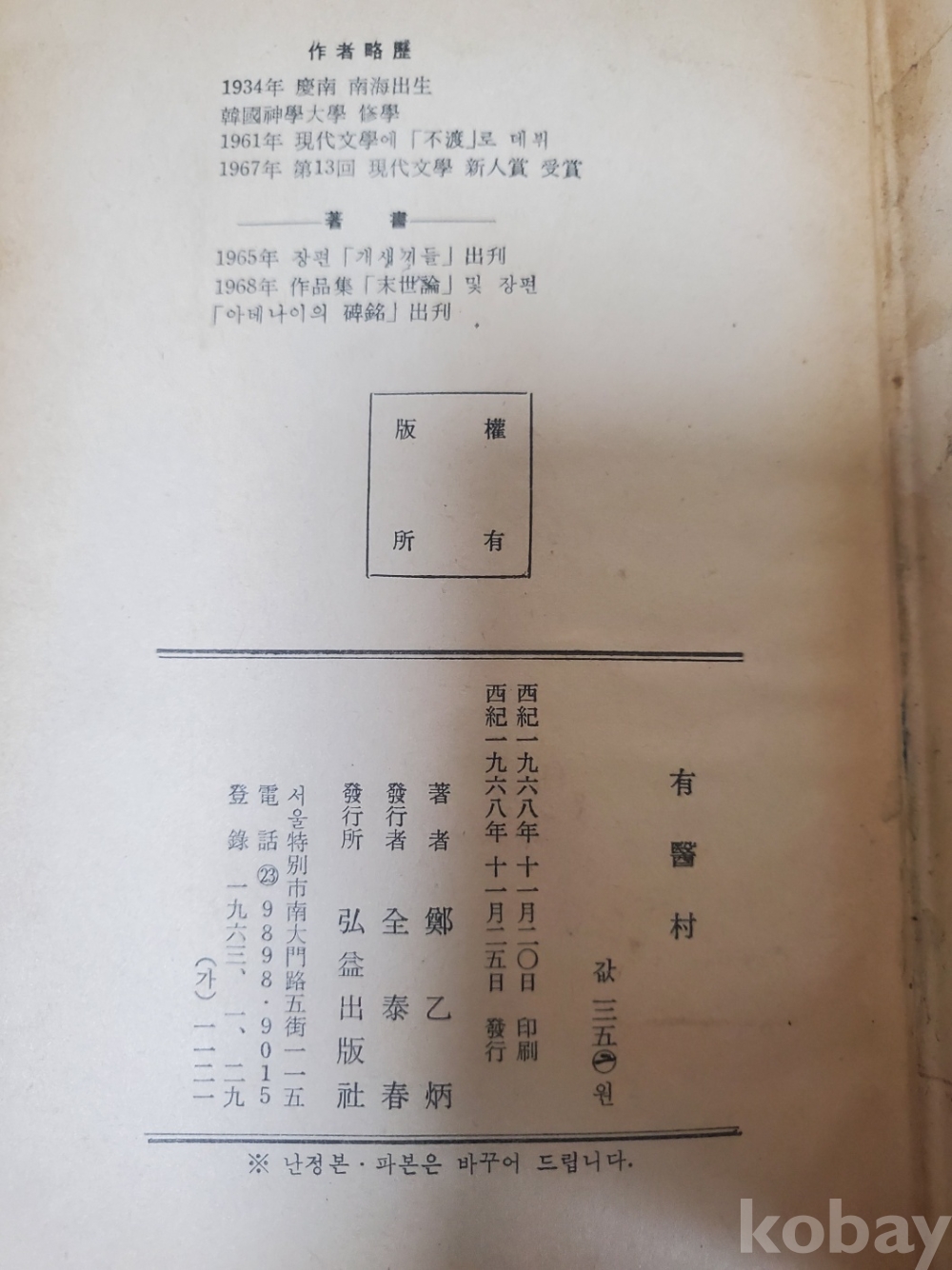 1. 유의촌, 정을병, 홍익출판사, 1968년, 261쪽, 상태 상, 사진 참조