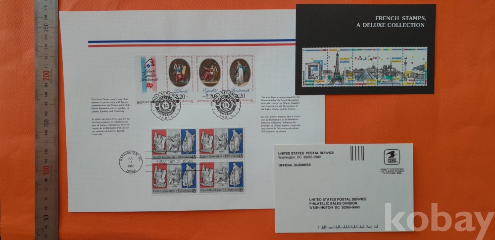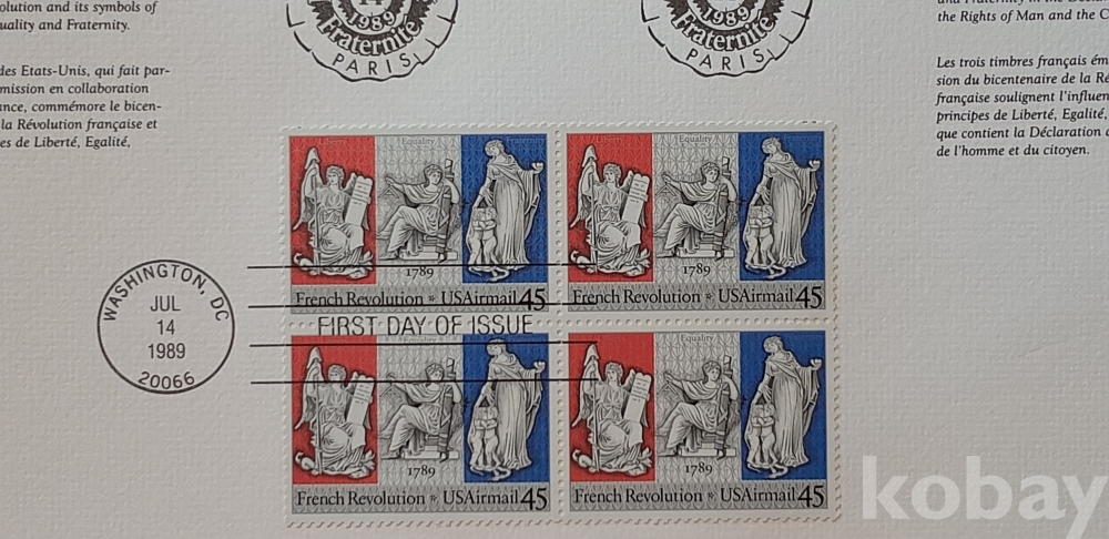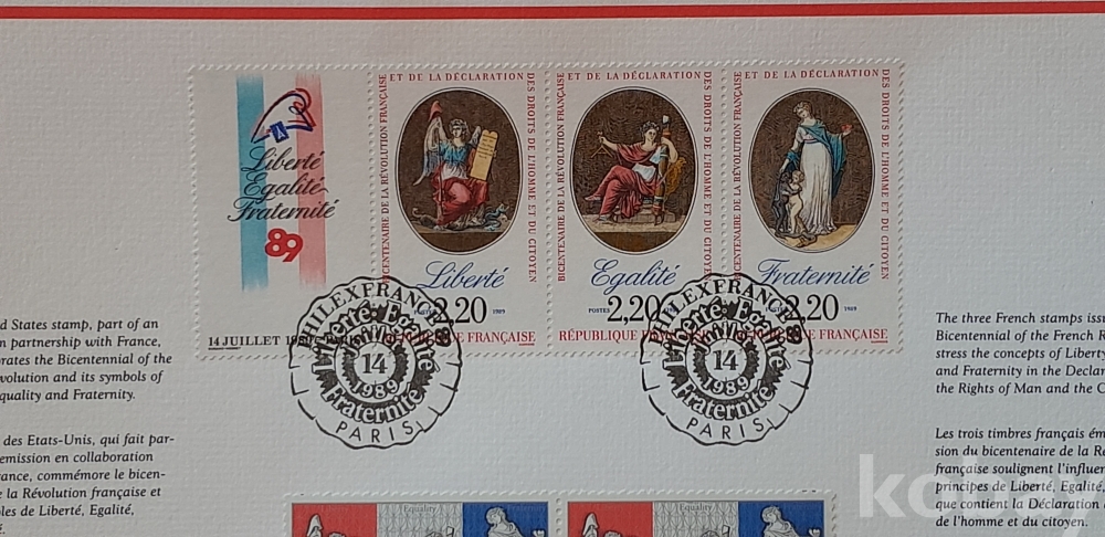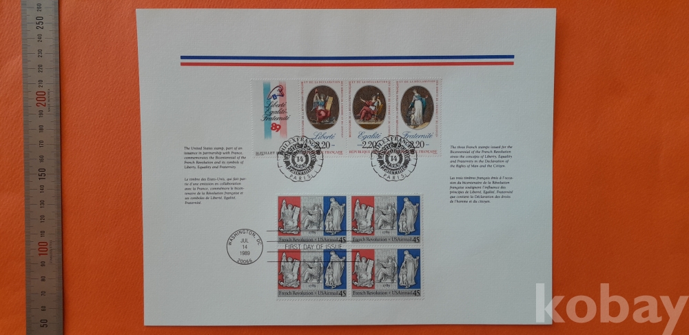 1989년 발팽 프랑스 독립 100년 기념(프랑스 파리, 미국 워싱인 기념인 소인) 우표 및 엽서 2종 입니다.