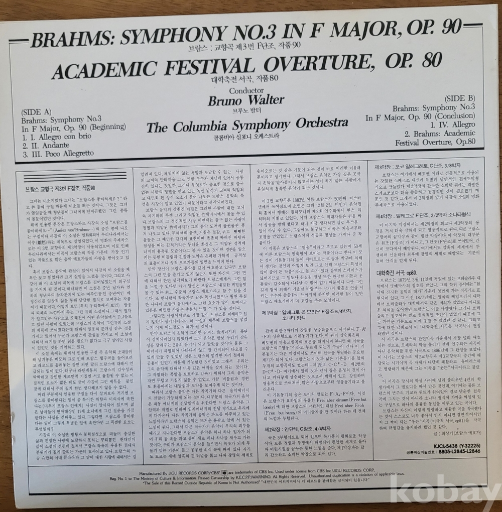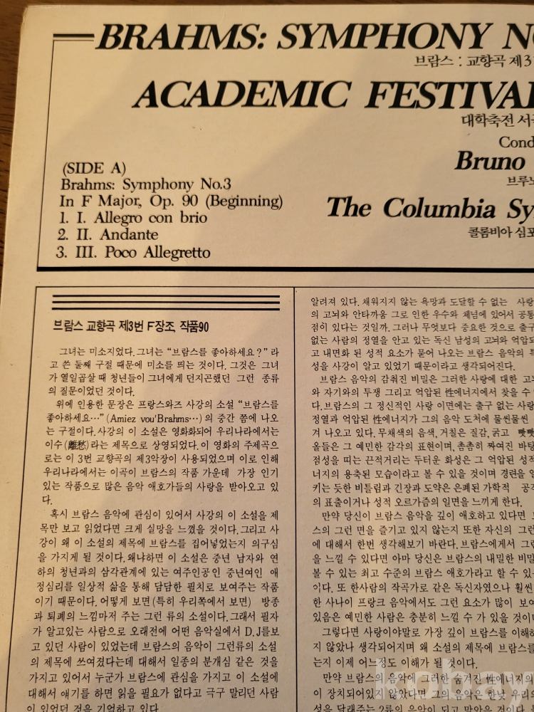 LP(☆10회미만 청음반☆)((☆☆브루노 발터 브람스 심포니No3☆☆))((클래식 100대명반))☆☆))