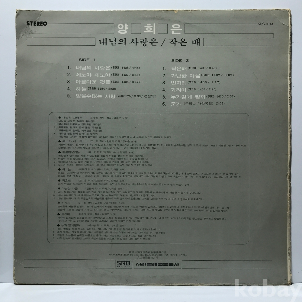 LP 22,670-65 양희은 - 내님의 사랑은/ 작은 배 76 서라벌 자켓 EX 알판 EX
