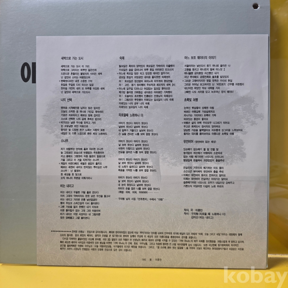 상품 설명 | Side A 1. 새벽으로 가는 도시 2. 나의 선택 3. 소나무 4. 비는 내리고 5. 숙제 Side B 1. 외로울 때 노래하나 더 2. 어느 보조웨이터의 이야기 3. 초록빛 여행 4. 유언비어 5. 장돌뱅이 (연주곡) |