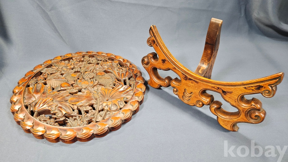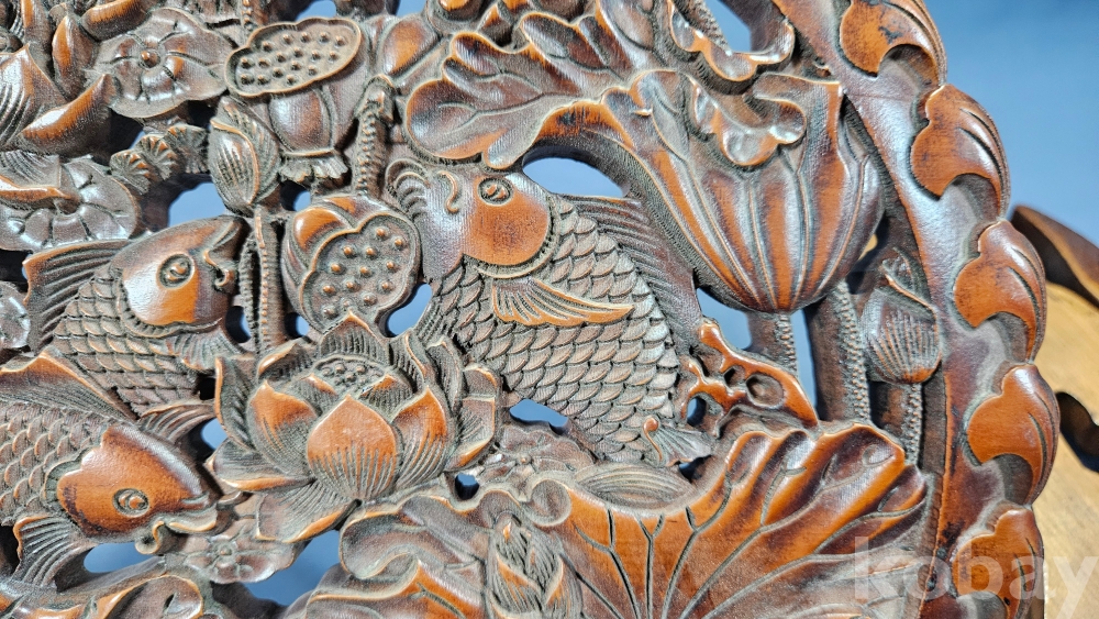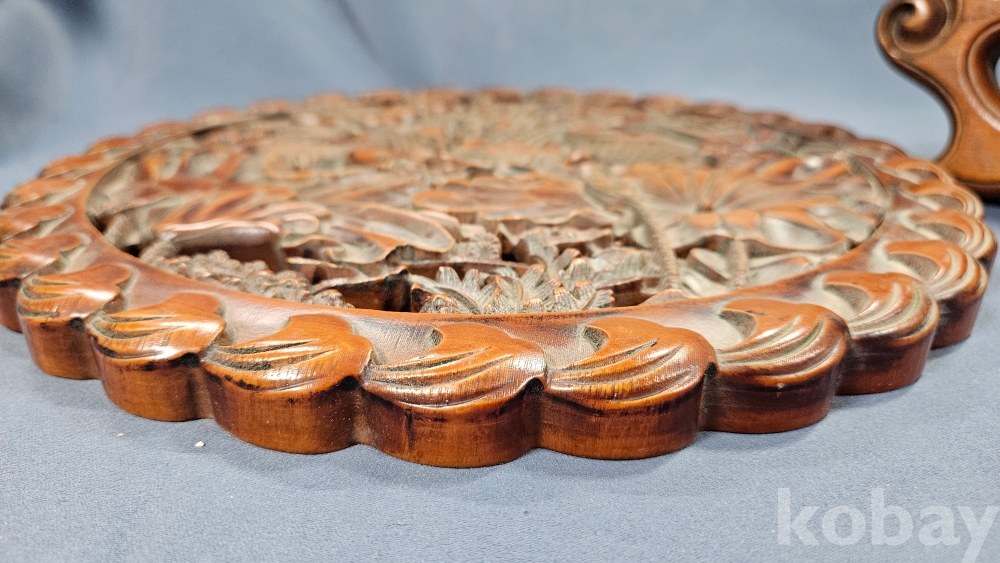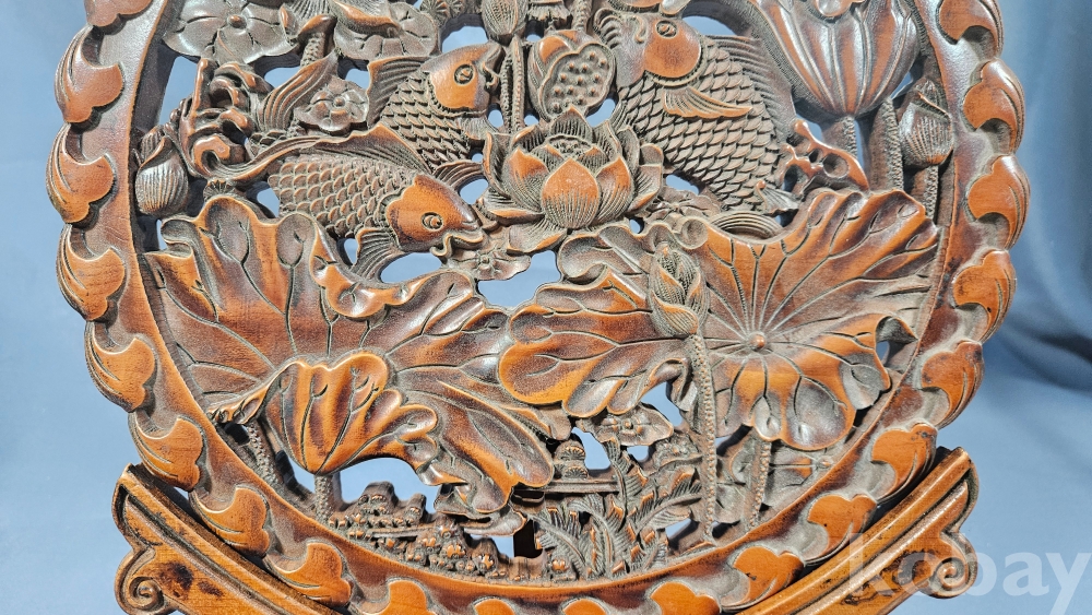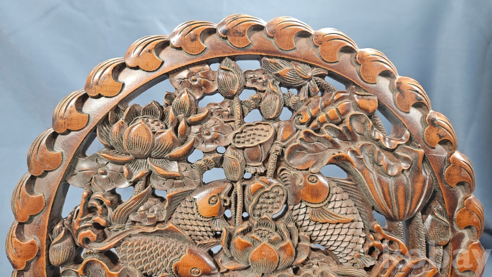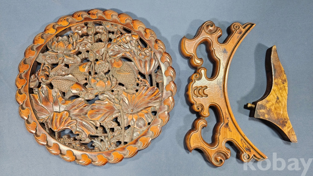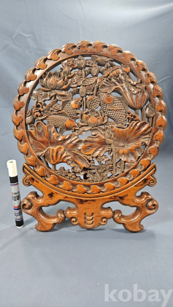 투각으로 문양이 조각되어 있는 큼직한 나무조각 장식품 입니다.