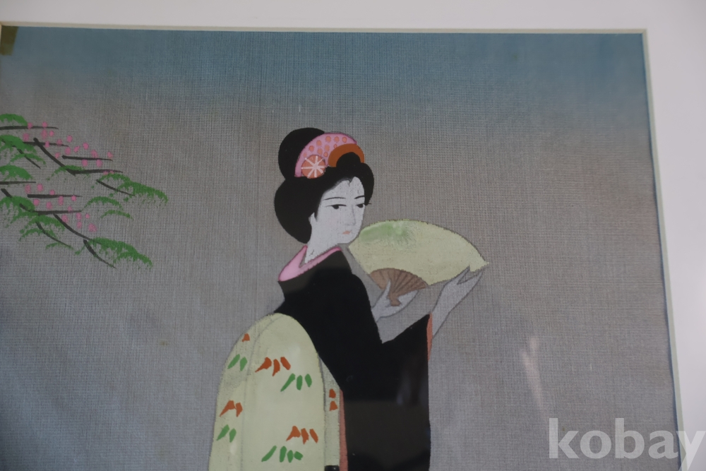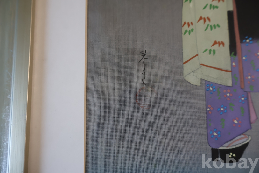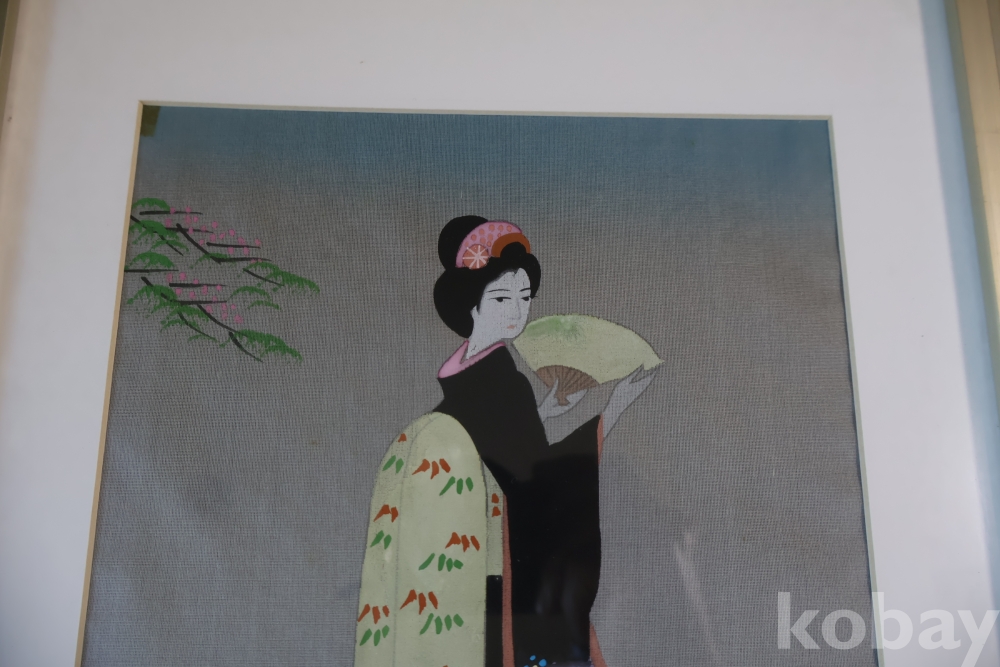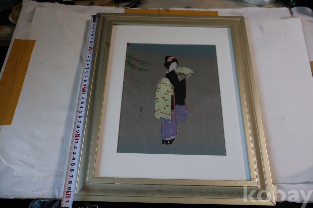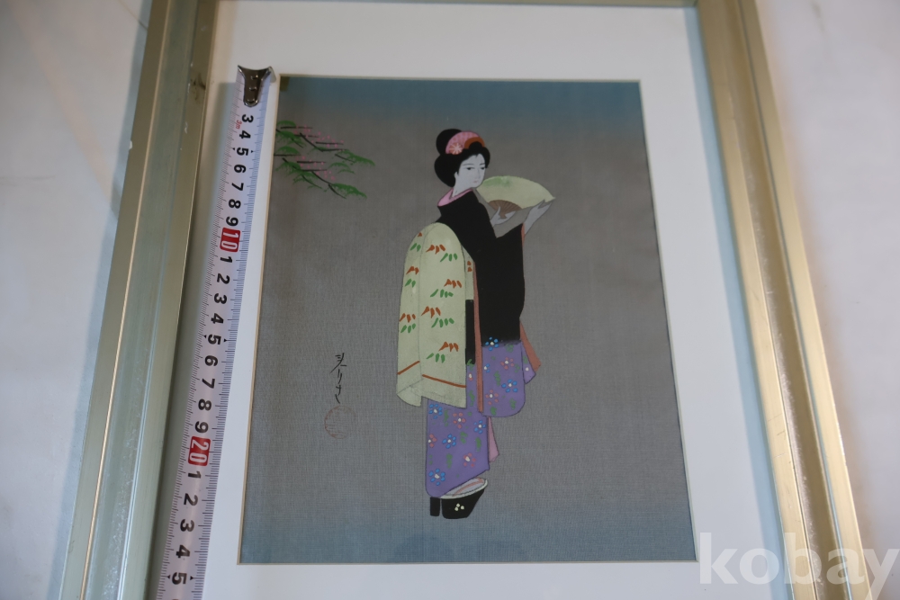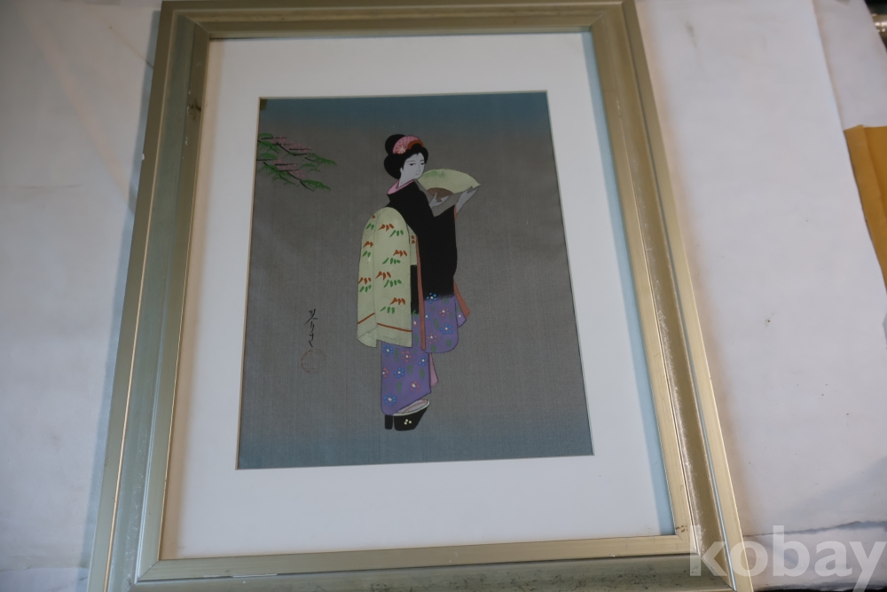 멋진 비단화 임니다 게이샤의 모습을 가진 화가의 낙관을 가진 명화 임니다 액자는 세월의 흔적이 보임니다