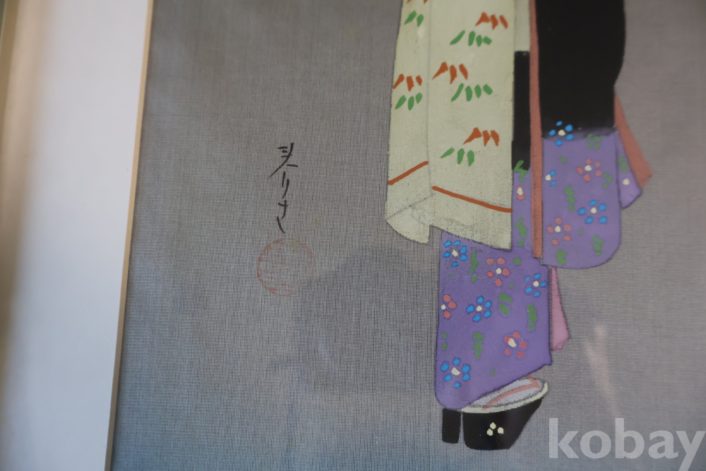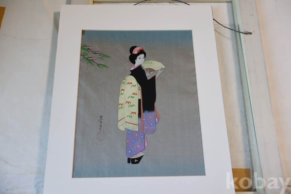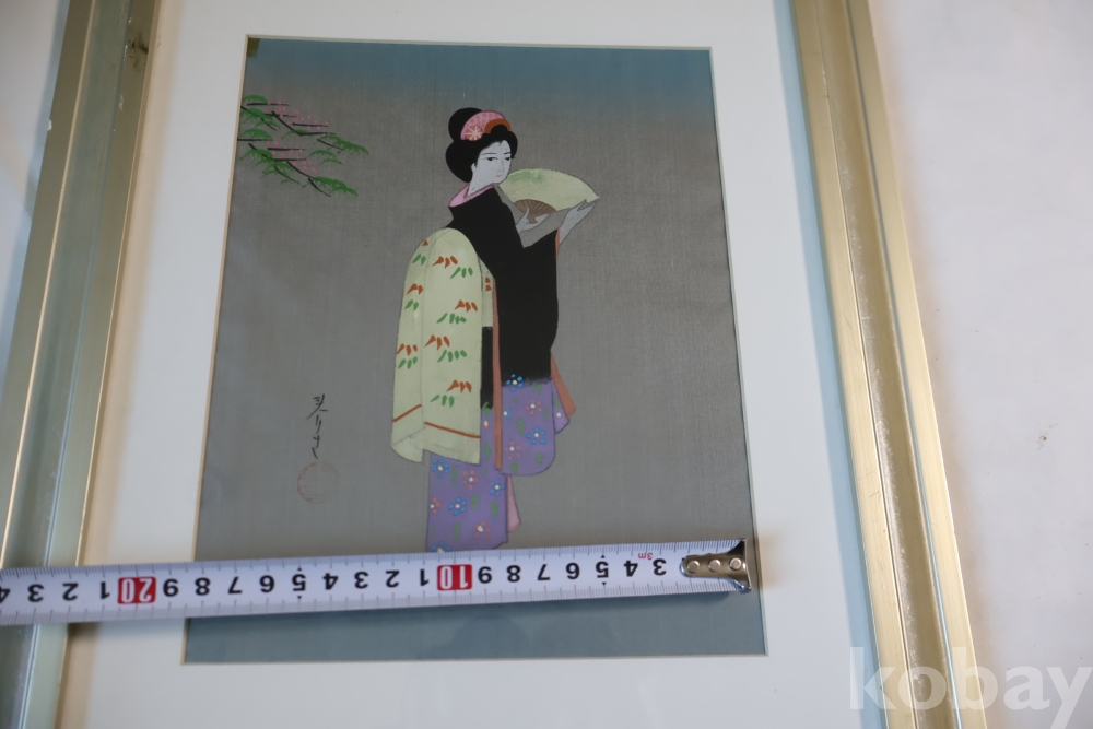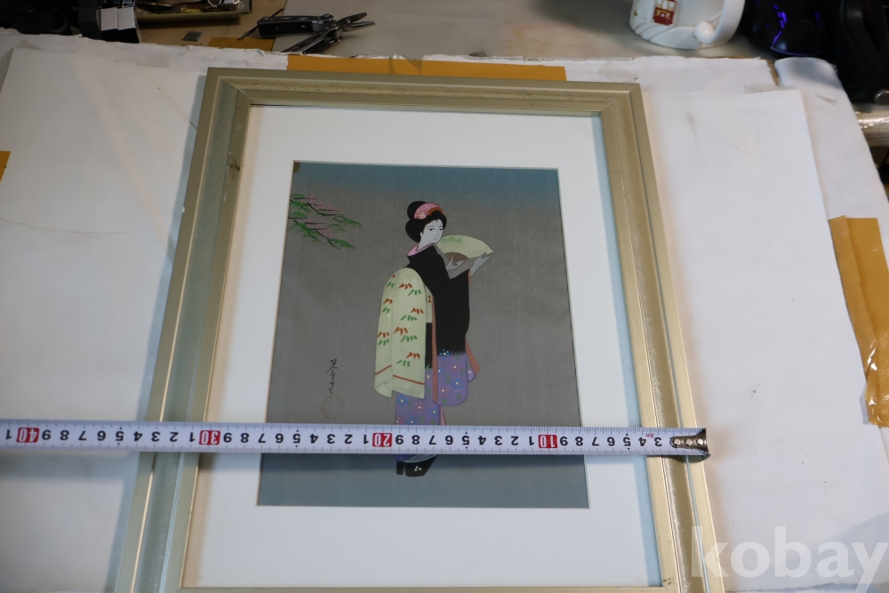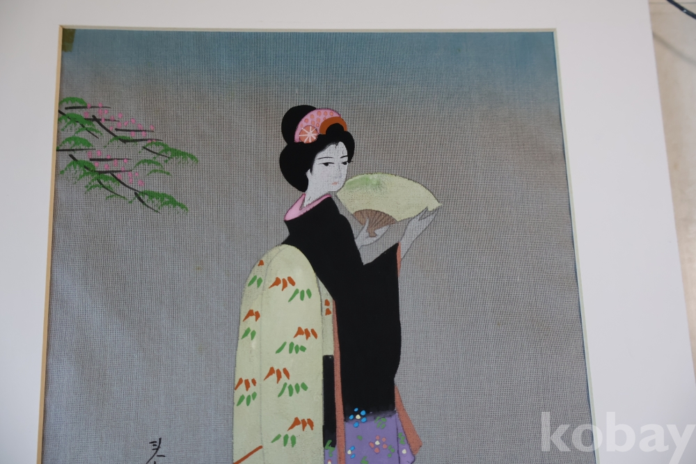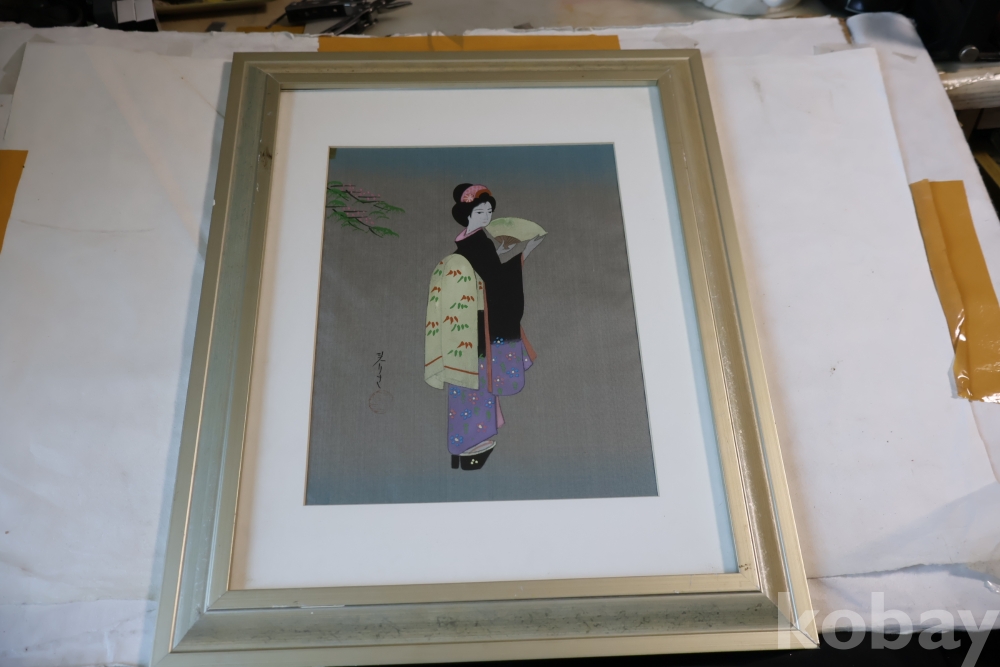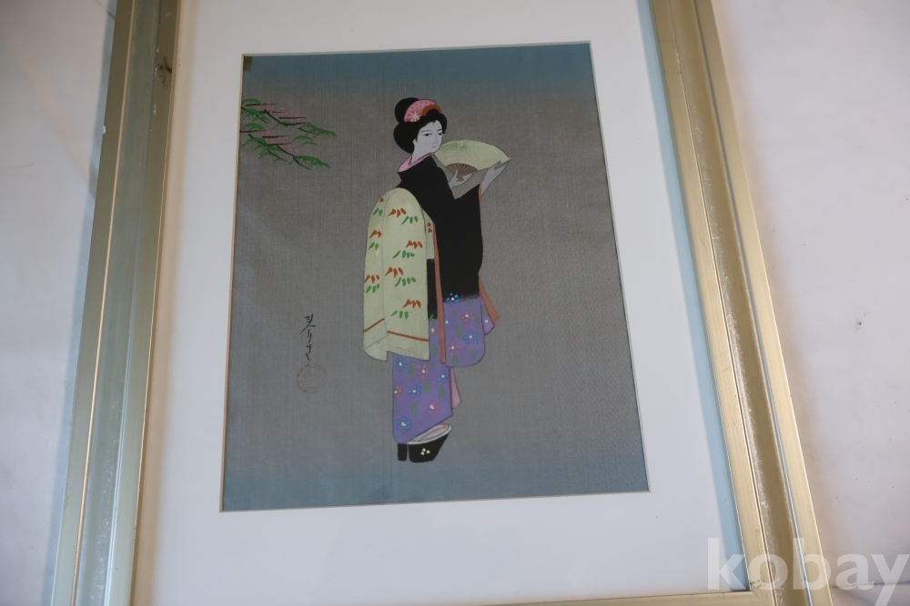 멋진 비단화 임니다 게이샤의 모습을 가진 화가의 낙관을 가진 명화 임니다 액자는 세월의 흔적이 보임니다