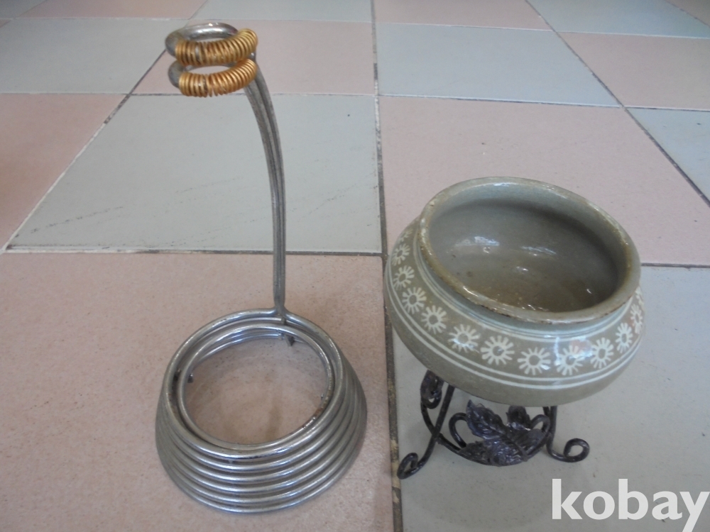 무거운 철사류로 감아 올린 특이한 받침대와 철사류로 3발이로 만든 받침대와 인화문 도자기 항아리 1점