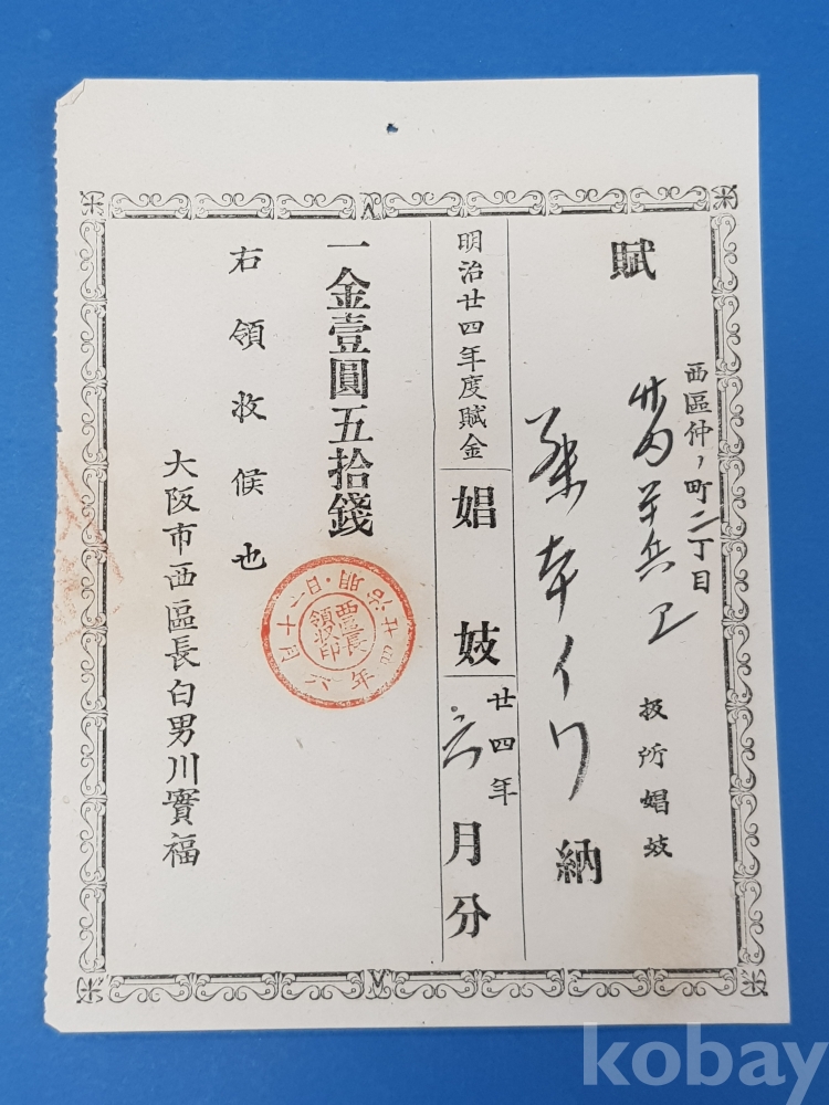 **** 明治24년도(1891년) 일본 오사카 娼妓賦金(창기부금) 영수증