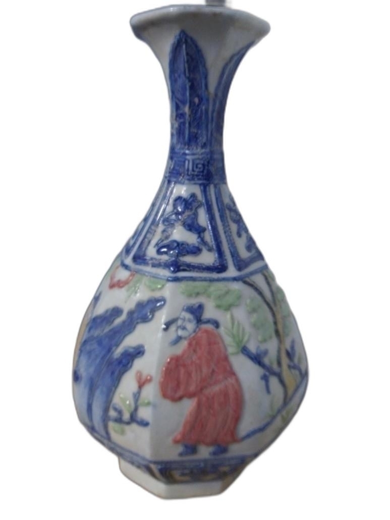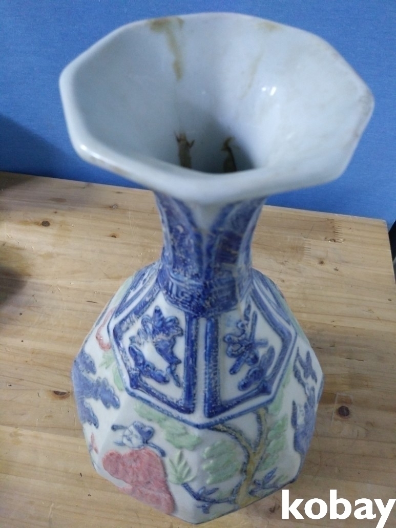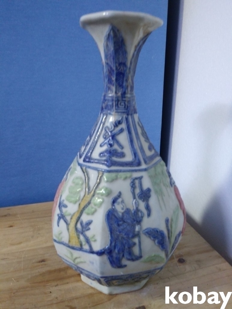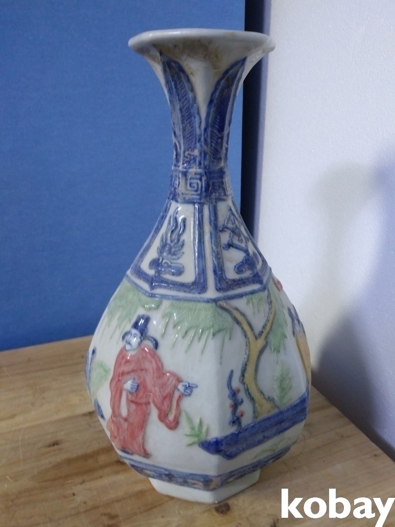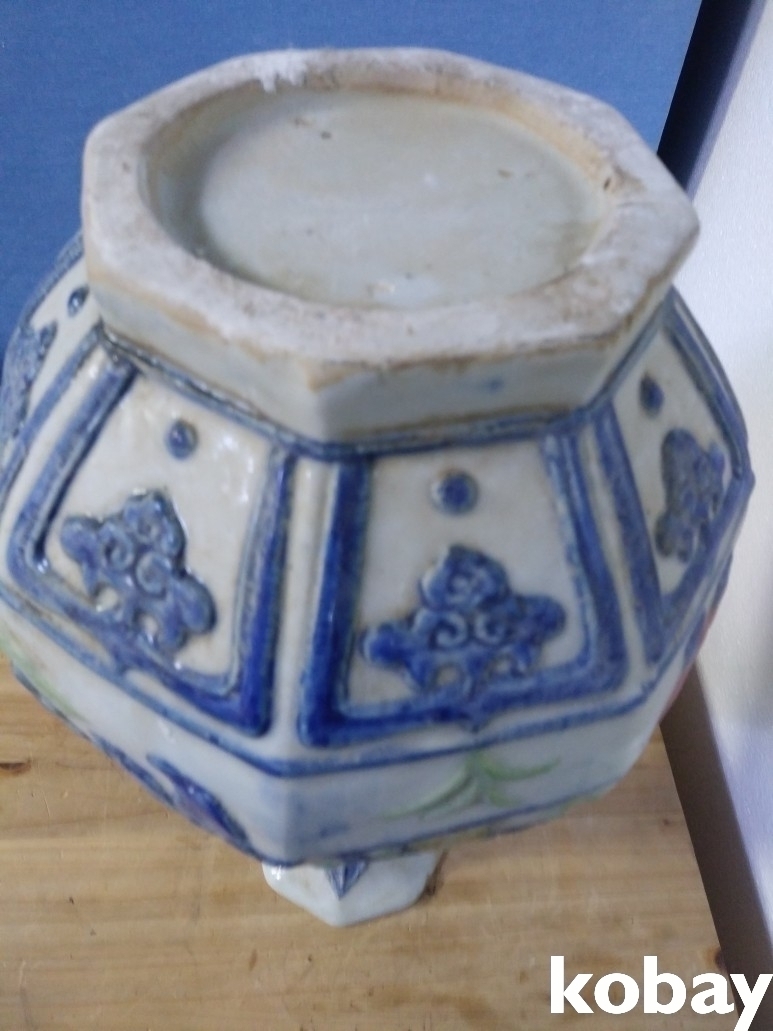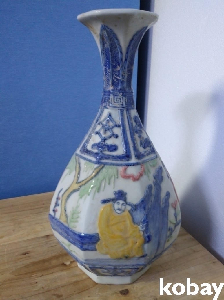 4인의 인물이 양각으로 있는 8각 도자기 입니다.