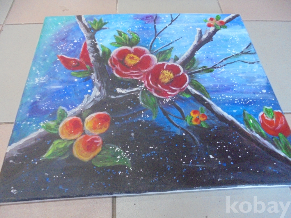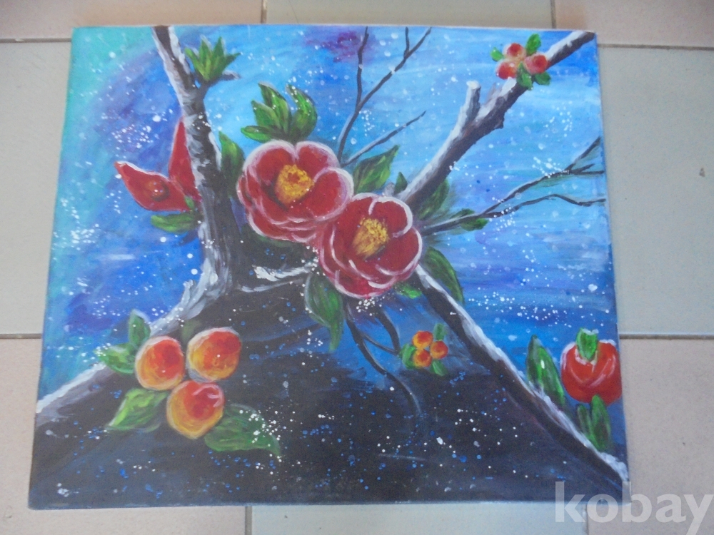 추운겨울에도 꽃을피우고 꽃송이전체가 떨어지는 잎이 반들반들한 고목나무에 꽃을피우는 뜻깊은 정물 동백꽃 유화판넬