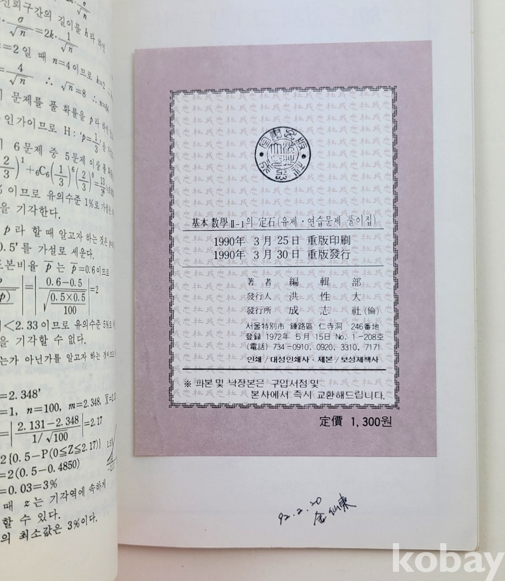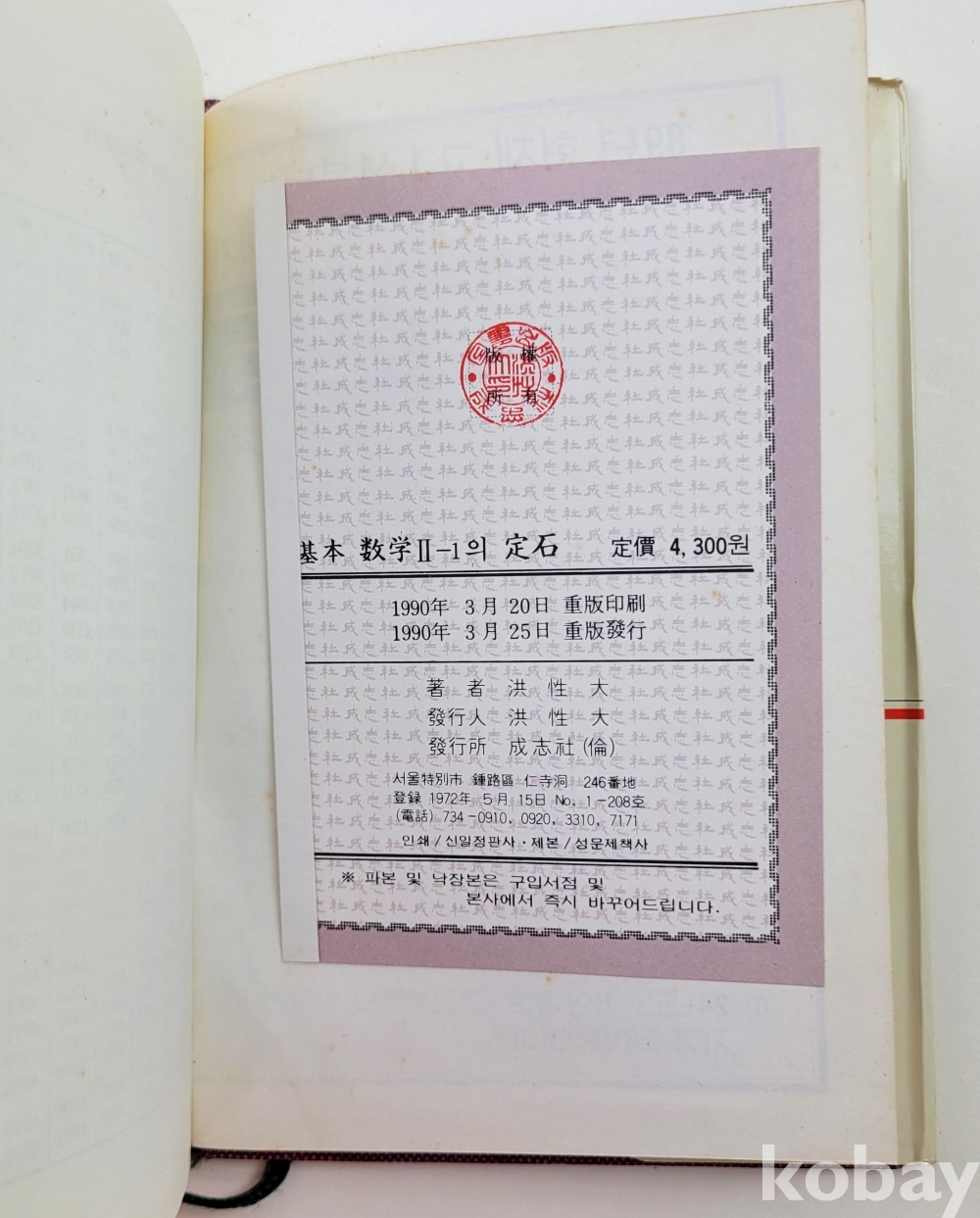 물 품 명 | 기본 수학(2)-1의 정석 & 유제 ⦁ 연습문제 풀이집 / 총2권 / 홍성대 / 1990년 / 성지사 |
