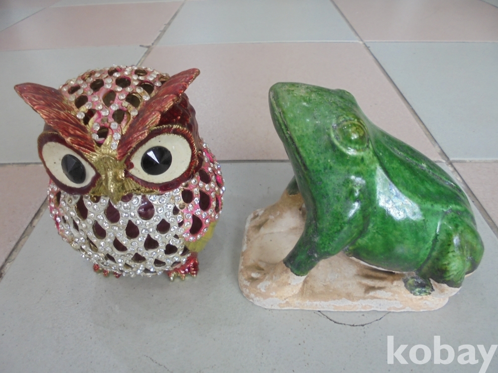 무거운 합금으로 아름다운 칠보로만든 지혜와 홍재 재산등 상징의 멋있는 부엉이와 마불로 만든 천하의 말썽꾸라기 큰 청개구리 총2점
