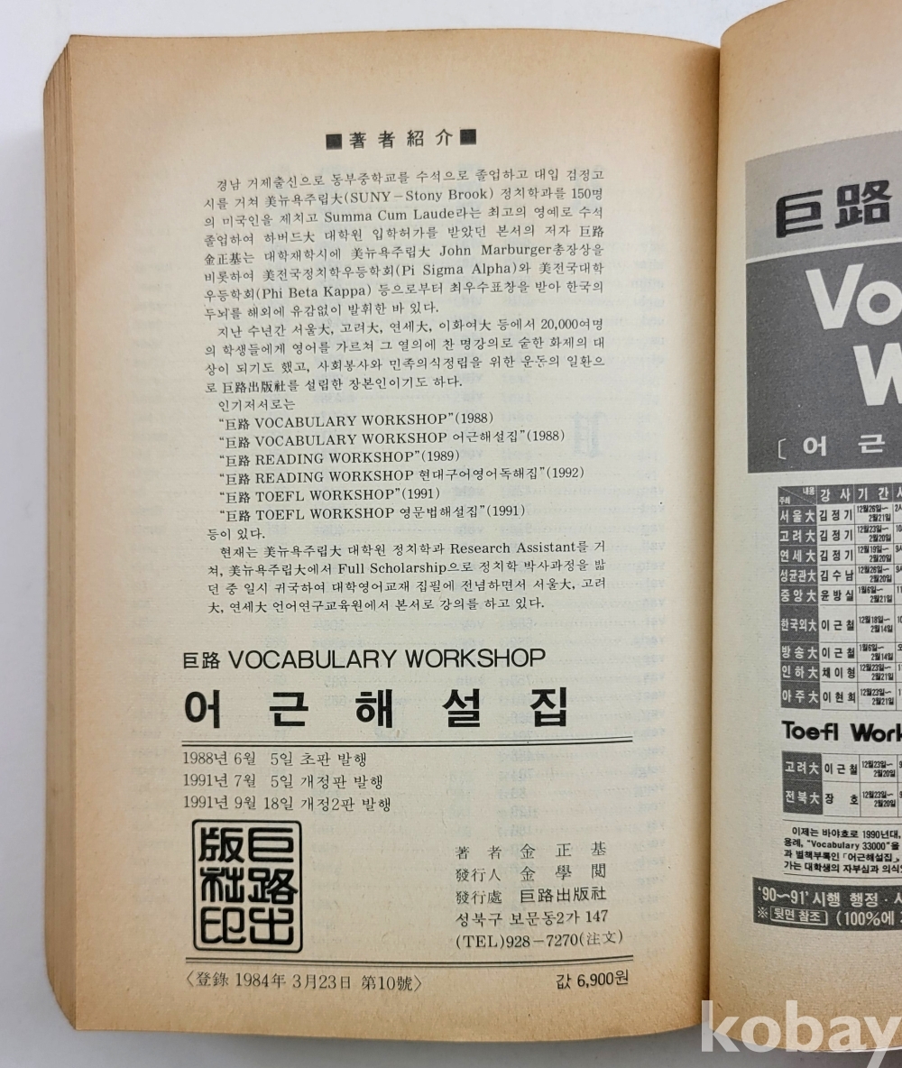 물 품 명 | 어근해설집 : Vocabulary Workshop / 1991년 / 김정기 / 거로출판사 |