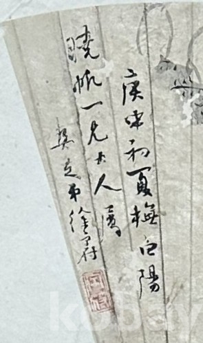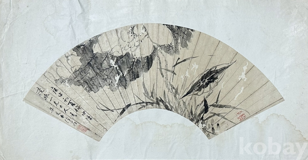본 작품은 부채형 화면 구성으로 제작된 동양 수묵 화조도 계열 회화 작품이다. 화면 전반에 자연 식물과 수풀, 조류 모티프가 유려한 먹선과 번짐 기법으로 표현되어 있으며, 부채 골 구조를 따라 방사형 구도가 형성되어 장식성이 뛰어나다. 좌측에는 필서와 낙관이 함께 배치되어 있으며, 일본풍 장식 회화 특유의 여백 구성과 화면 균형감이 잘 드러난다. 종이 바탕 특성상 세월에 따른 자연스러운 주름과 색감 변화가 존재하나 전체적인 화면 보존 상태는 안정적인 편이다. 인테리어 장식용, 동양화 컬렉션, 일본풍 회화 수집용으로 적합하다.