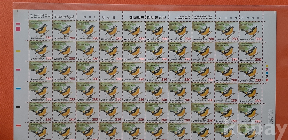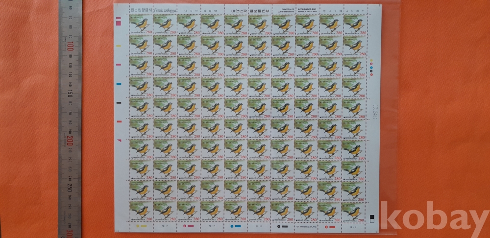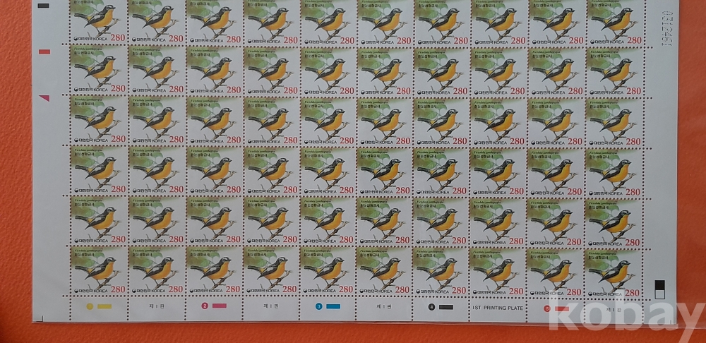 2002년 기본료 190원 시기 280원 흰눈썹황금새 100매 전지 입니다.