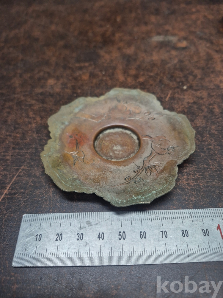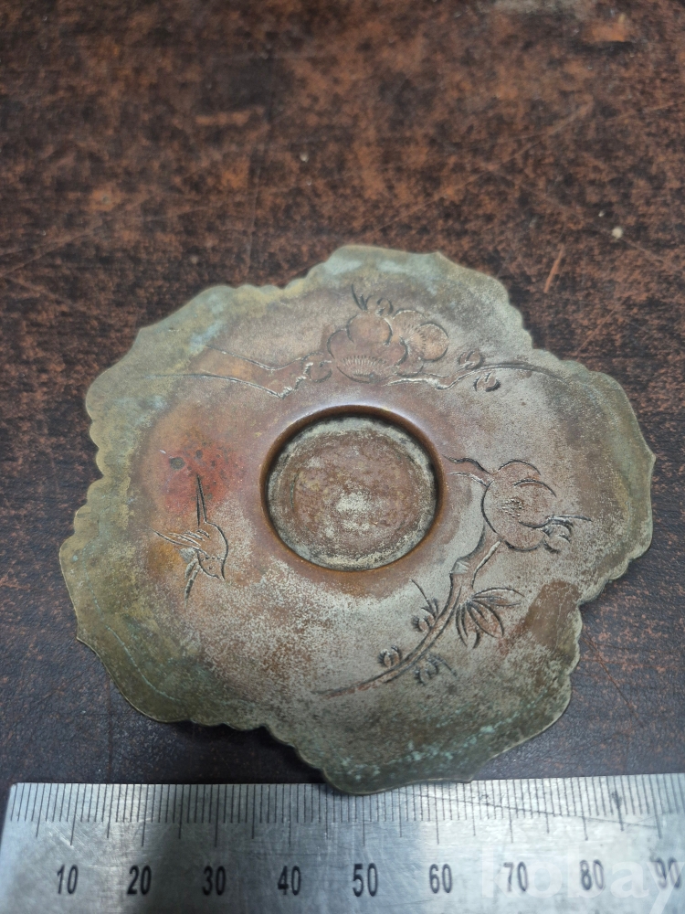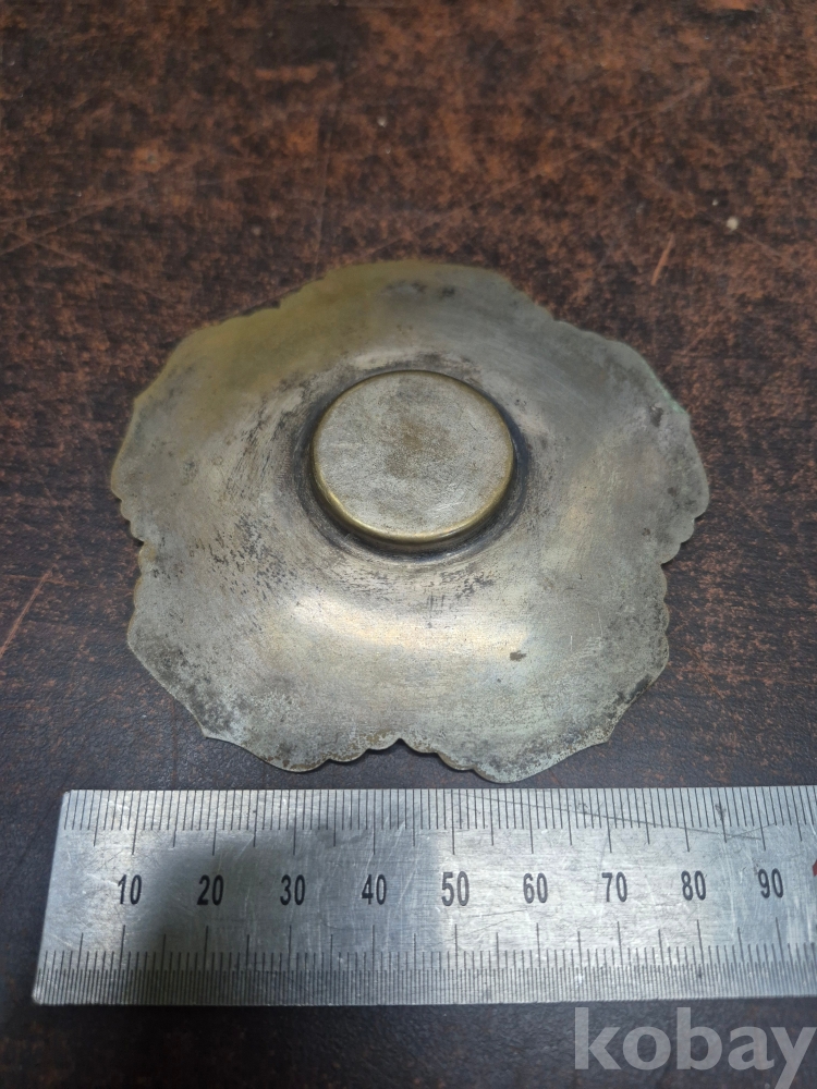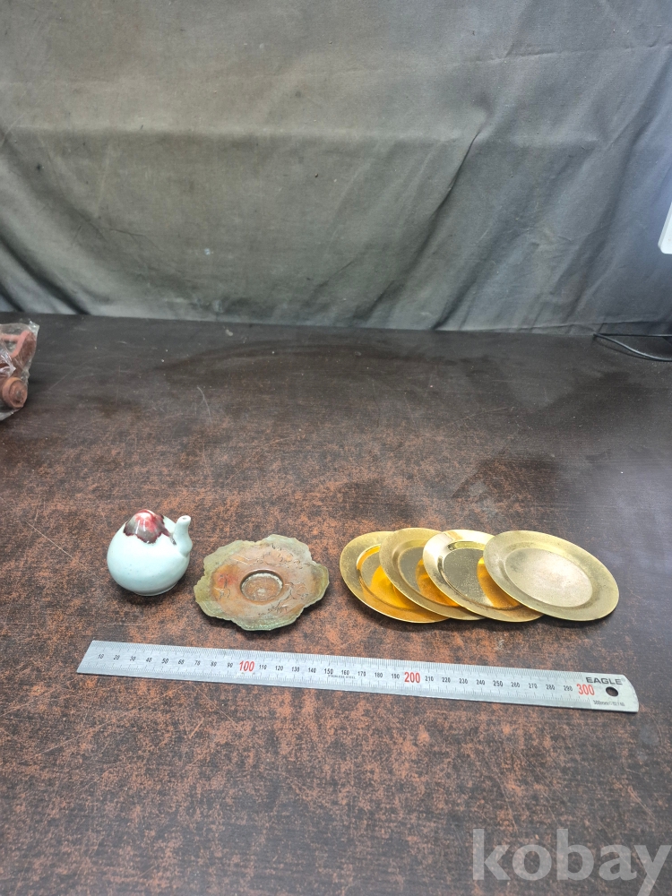 복숭아 모양 도자기 연적 1점 동 찻잔받침 이화꽃 문양 1점 동으로 만든 차받침4점 일괄 5*5*5