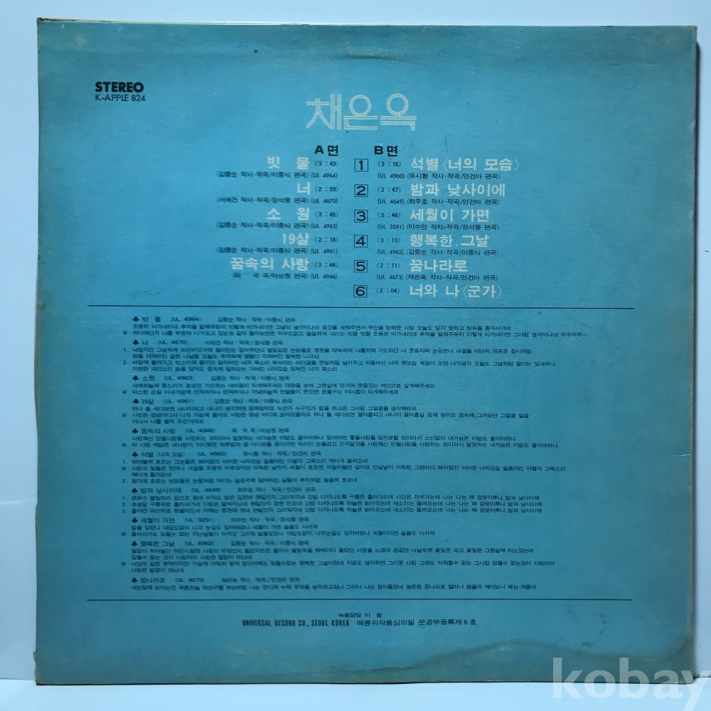 LP 22,447-8 채은옥 - 빗물 자켓 EX 알판 EX 76 년 국내반