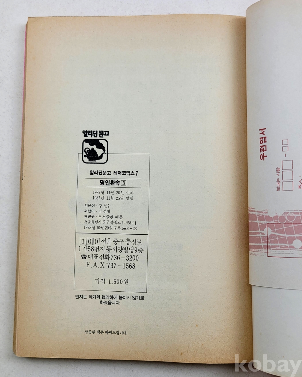 물 품 명 | 강철수 장편바둑극화 / 명인환속 (3) / 알라딘문고 레저코믹스(7) / 1987년 초판 / 예음 |