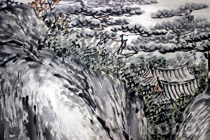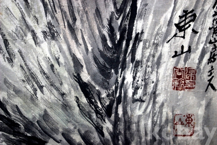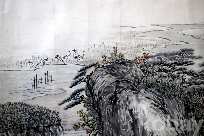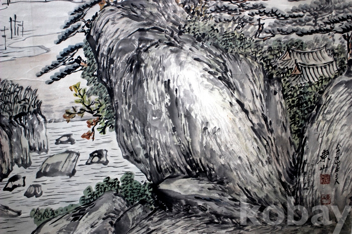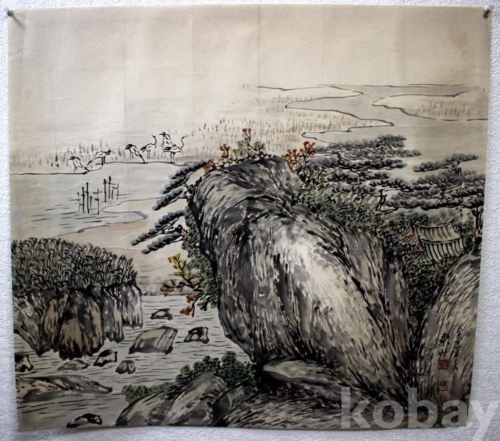 국전 입선작가인 東山(동산) 양용범의 작품 - 학과 산사가 있는 강가의 초가을 풍경
