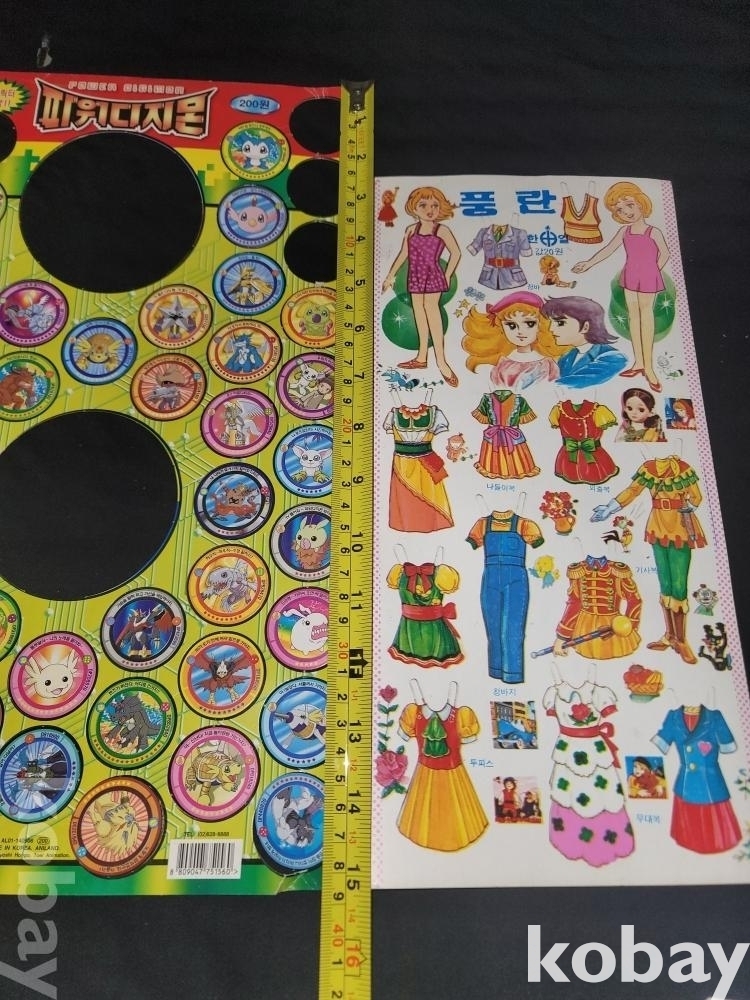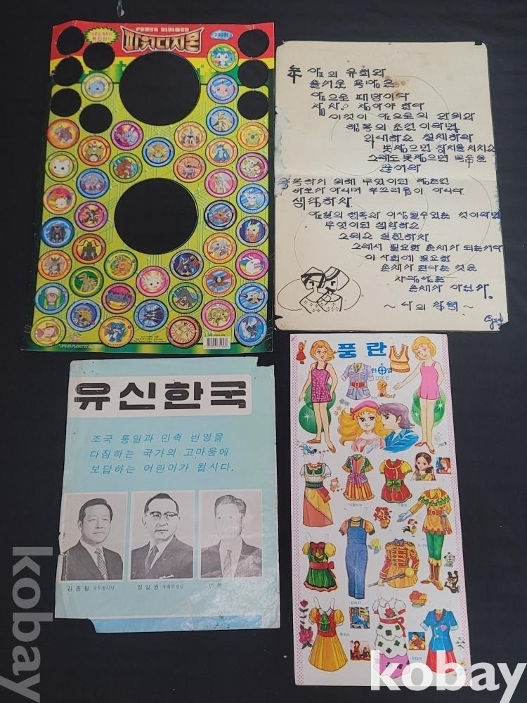 빈티지 추억의 70~80년대 인기 있던 옛날 종이인형과 글이 적힌 종이, 파워 디지몬 종이 딱지, 유신 한국 잡지 스크랩 등 일괄입니다.