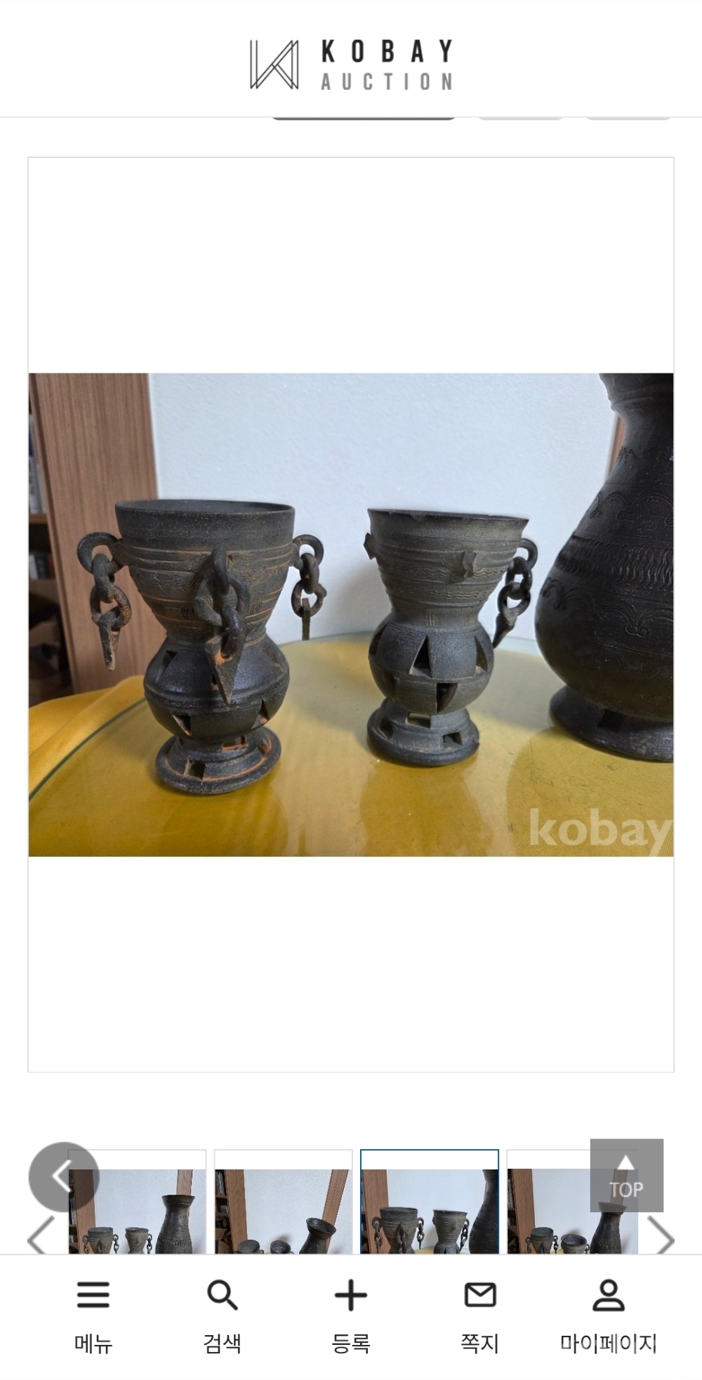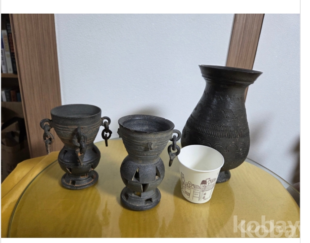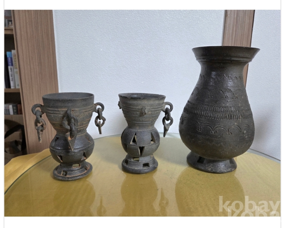 토기 3종일괄 다 드립니다 사진대로 갑니다 세월감으로 잔대는 하나는 귀가 살아있으나 영락 탈락있네요ㆍ높이 주병20 잔13