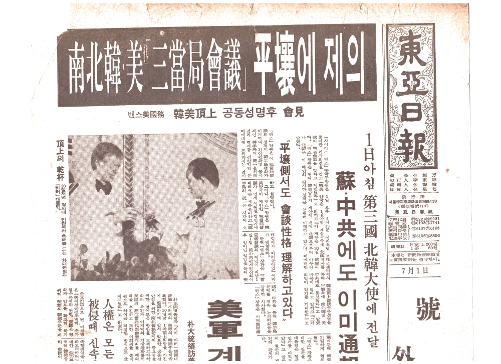 <남북한. 미국 3당국 회의>를 평양에 제의했다는 속보를 전한 호외.