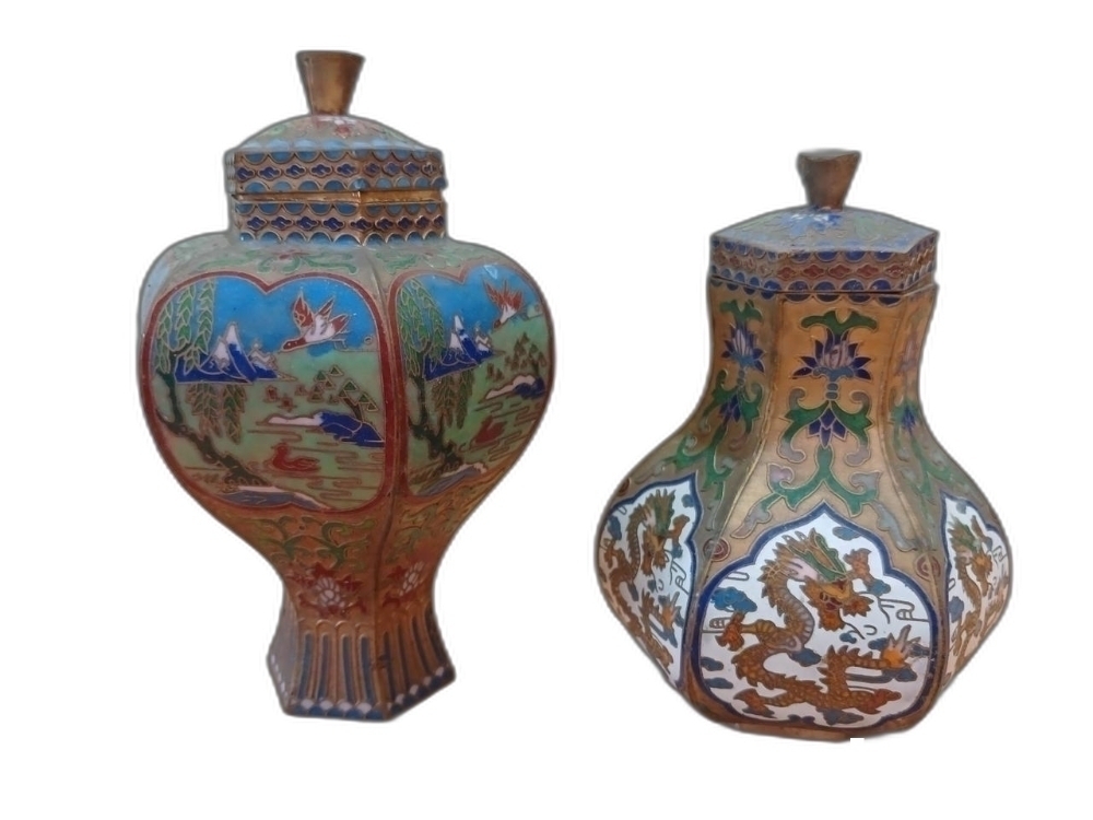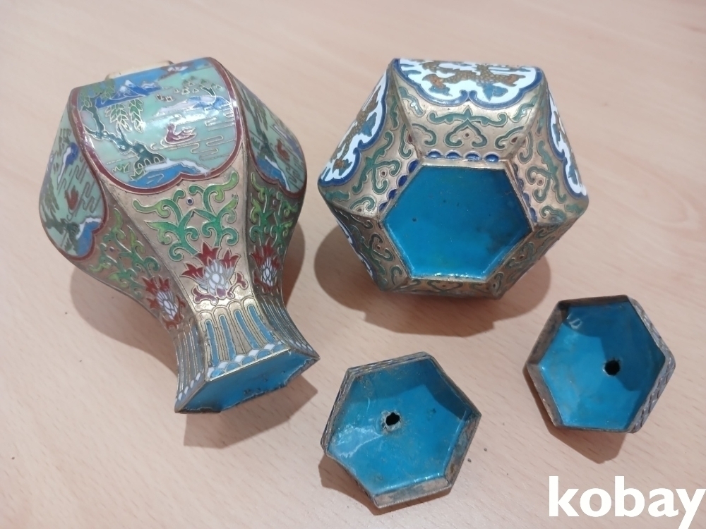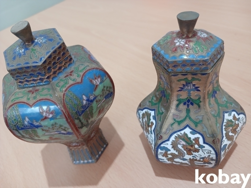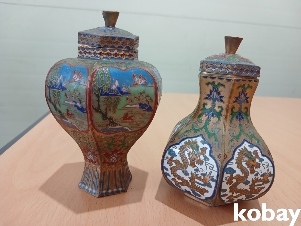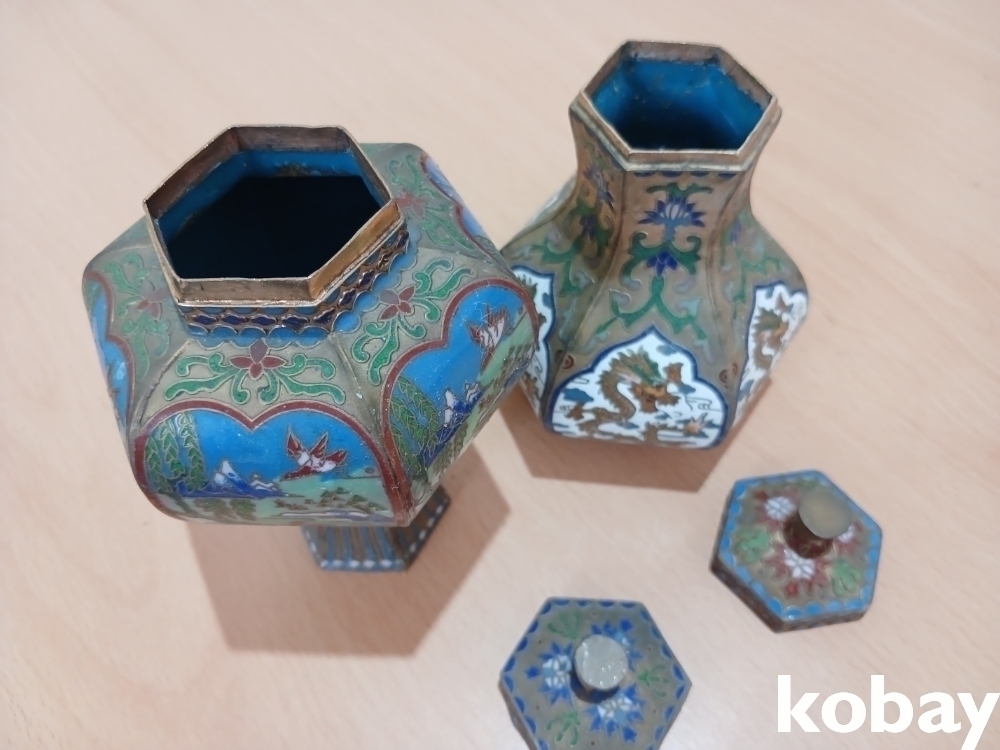 색감이 아름다운 동 칠보 6각 도자기 모양 2개 입니다.