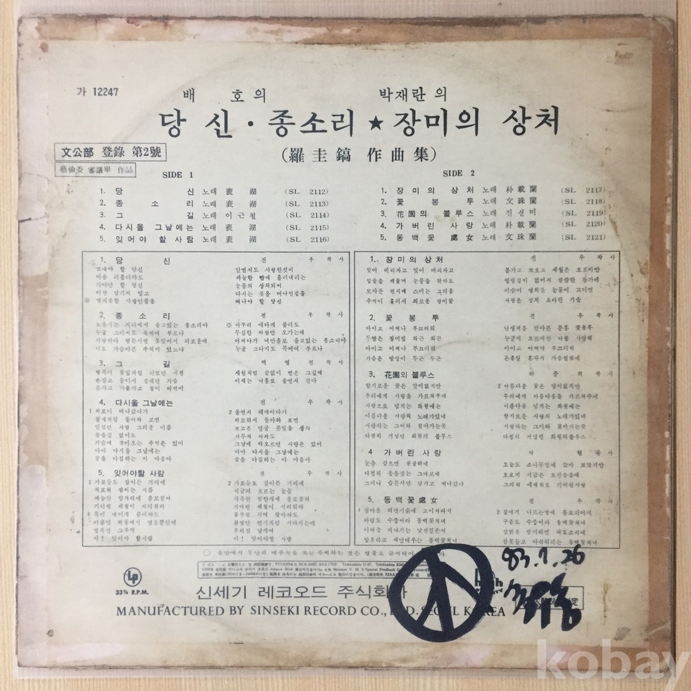 . 가요음반 대부분은 휘어짐이나 손상을 방지하기 위해 무지싱글자킷을 하나 더 사용하여 보관되었던 음반들입니다.