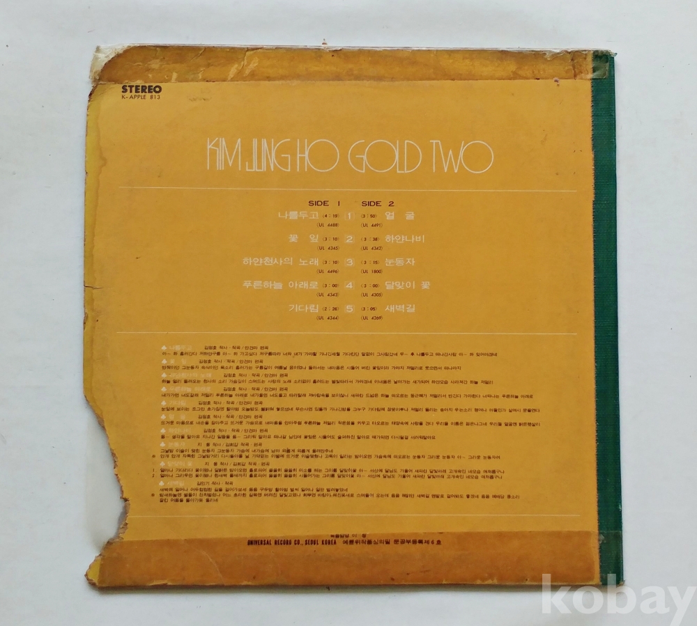 | 자켓상태 | VG : 주름, 접힘, 모서리 찢김 다수 | 음반상태 | EX : 재생에 영향 없는 가벼운 기스 존재 | 발매정보 | 알수없음 | 가사지여부 | 무 |