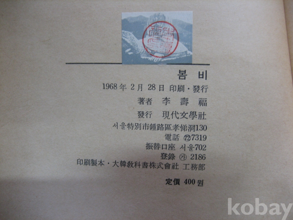 1. 제목 : 이수복 시집- 봄비 단권(1968년 초판)