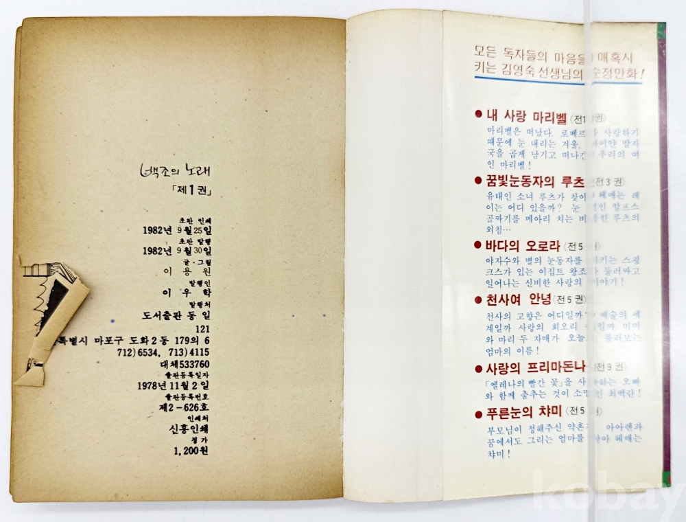 상품 설명 | 이용원 작가의 순정만화 '백조의 노래' 1편이다. 89p ~ 끝페이지 책 분리됨 총 153p. | ||