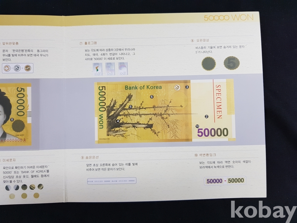 - 권종별 화폐첩은 3단으로 접혀있으며, 디자인 소재 설명.
