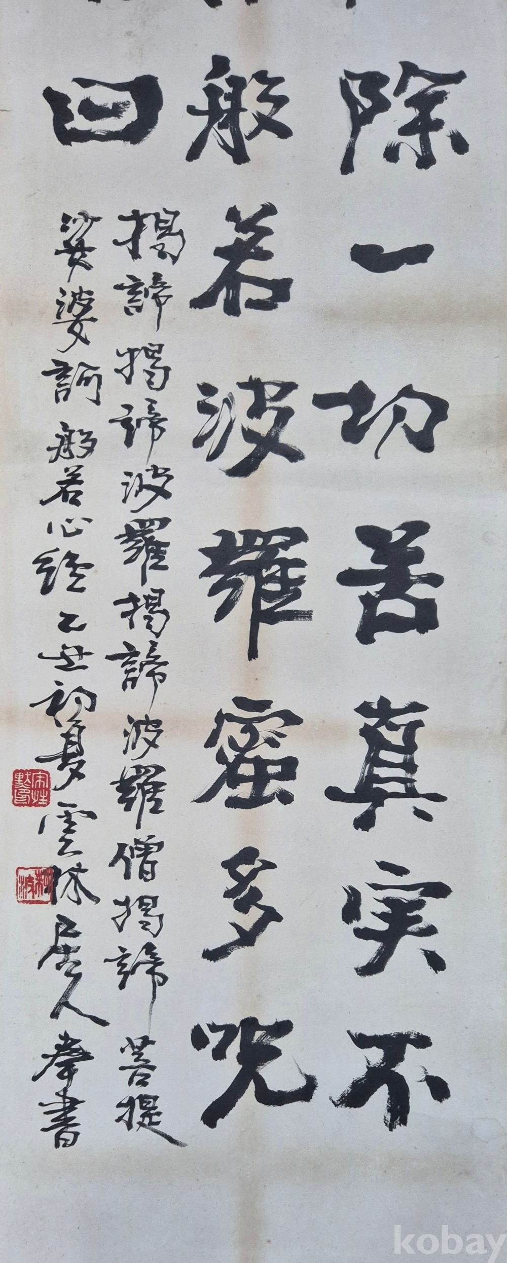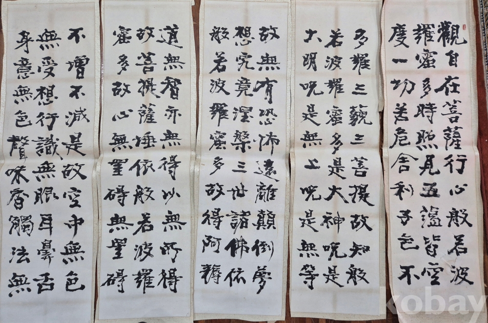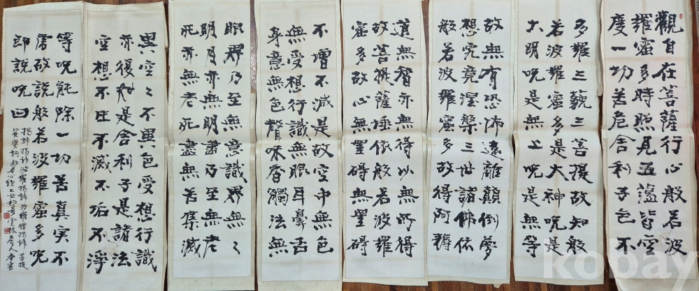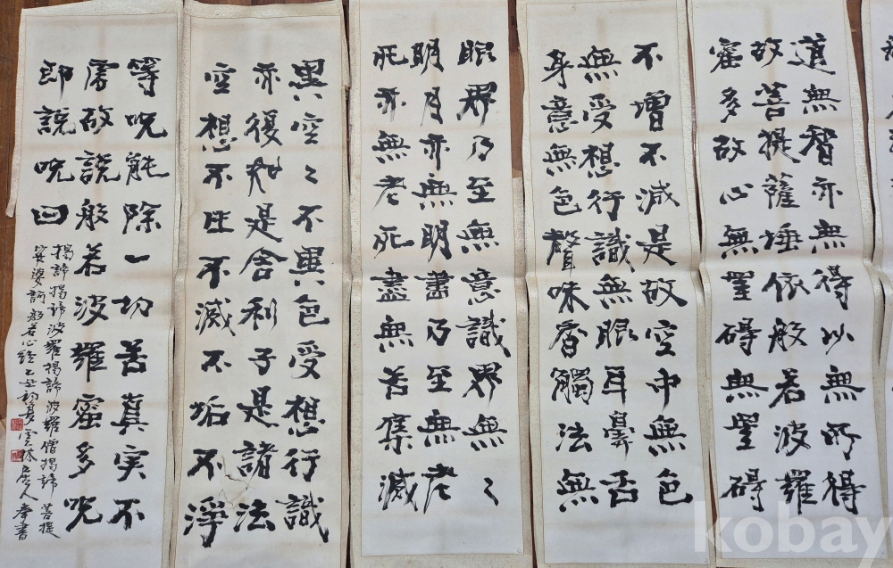 독특한 서체의 대가 작품 추정되는 반야심경 서예 병풍'이오니 작품 이미지상 수결 및 낙관'등 두루 잘