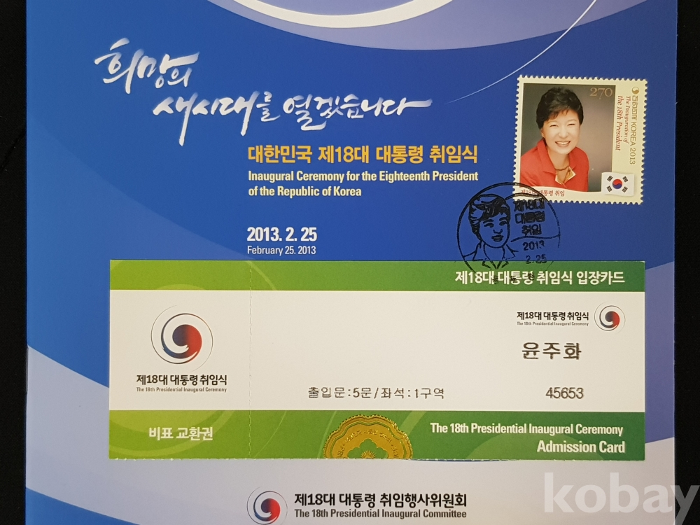 - 표지에 취임식 입장카드/ 비표 교환권/취임 기념우표/ 취임기념 일부인