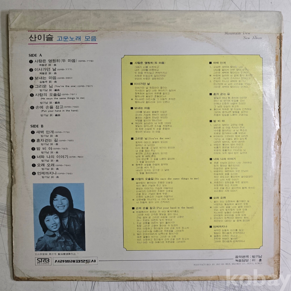 | 자켓상태 | VG : 주름, 접힘, 모서리 찢김 다수 | 음반상태 | VG : 생활 기스 다수, 가벼운 노이즈 존재 | 발매정보 | 초반 | 가사지여부 | 무 |