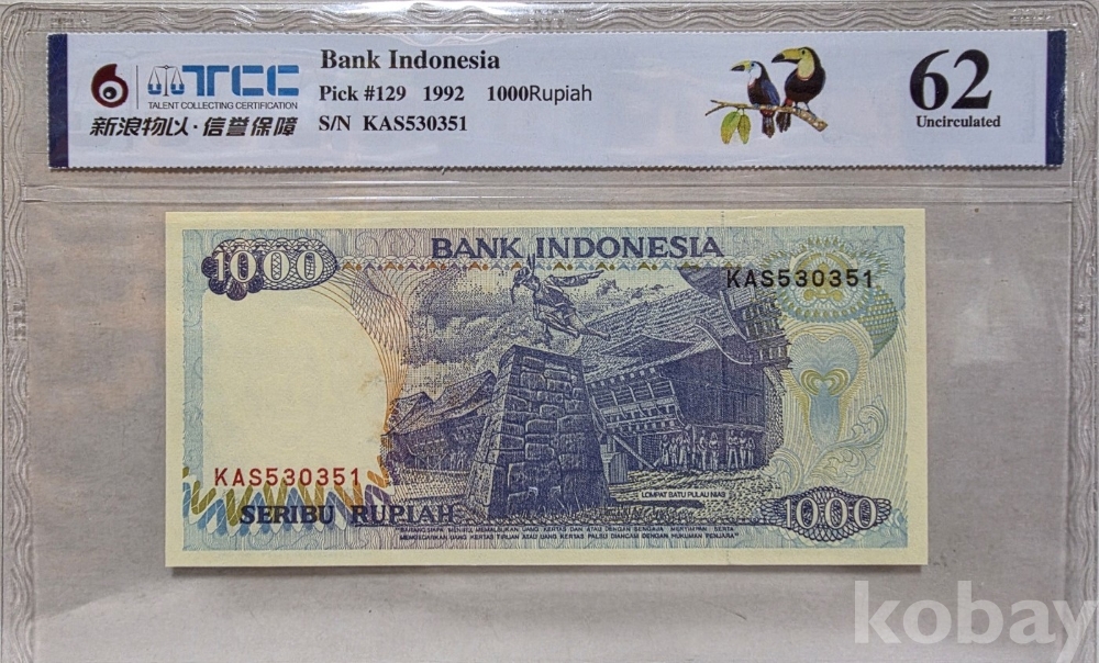 -1992년 인도네시아 1000루피아 지폐 TCC62 등급 입니다.